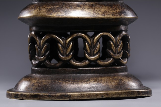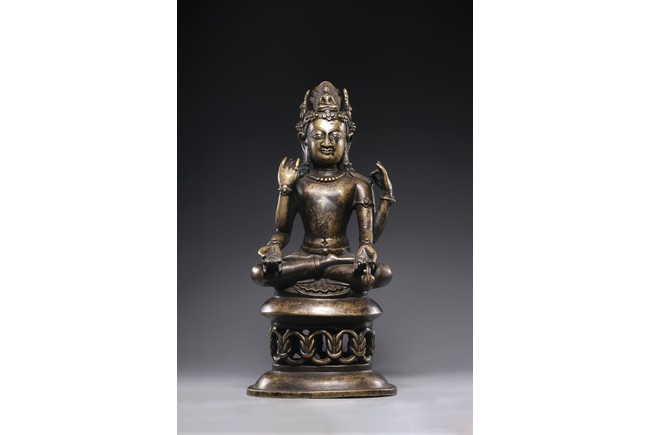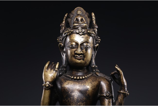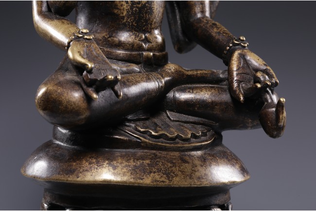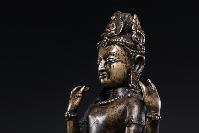 此像採用精煉合金銅製成,形體姿態豐滿柔美,頭戴三葉冠,面龐極為圓潤,眉線修長柔 美,鼻樑挺拔。其中眼睛鑲嵌白銀,上下嘴唇鑲嵌紅銅,這類特徵是早期造像的特徵。左右 雙臂上舉結“說法印”,另外雙臂置於膝前,一手結“說法印”,一手持寶瓶。安坐於高台 座上,台座中部鏤空。整尊造像面容清秀,身姿優美,力度十足,肢體塑造具有強烈的線條 感,表現出很強的藝術感染力。