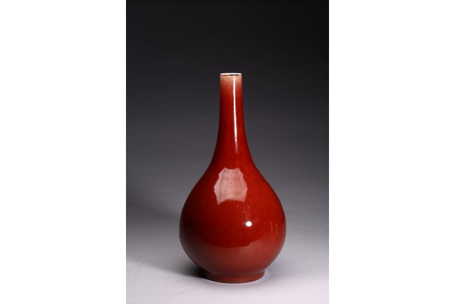 Chinese. The tall pear-shaped body supported on a straight foot and rising to a tapered neck, overall suffused with attractive cranberry-red glaze. Qing Dynasty period.