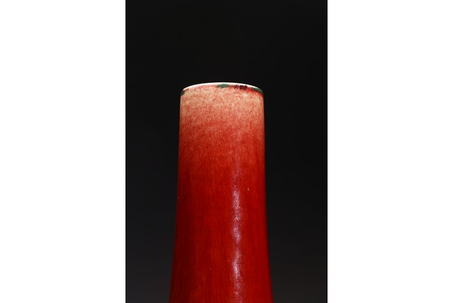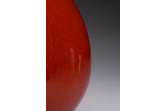 小口,細長束頸,溜肩,鼓腹,圈足,足部平滑,胎質堅固細膩,通體施紅釉至足底,釉質光潤,紅釉色澤鮮艷奪目,且通體顏色一致,極為難得,瓶身比例勻稱,線條自然流暢,造型優美。