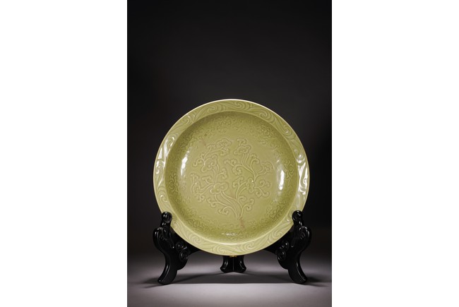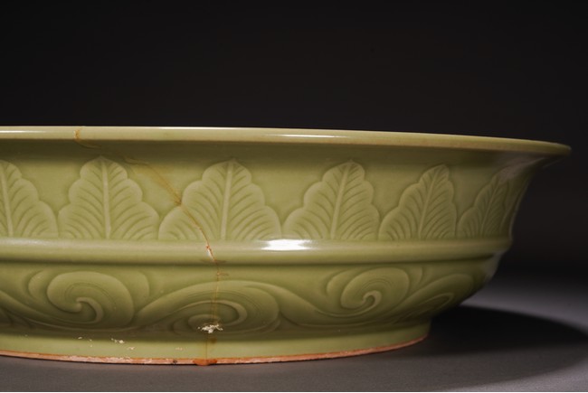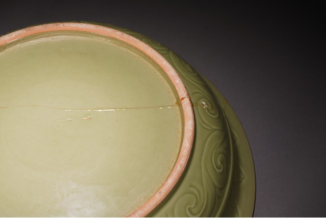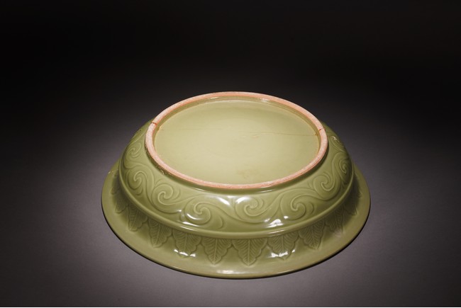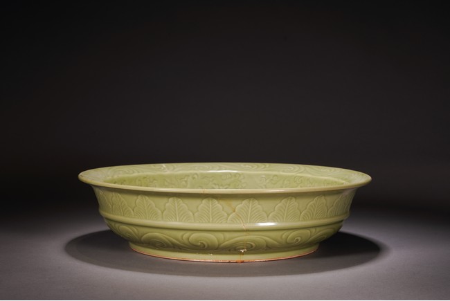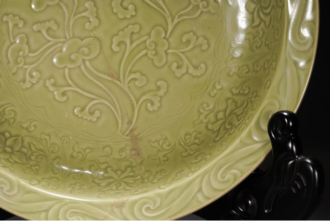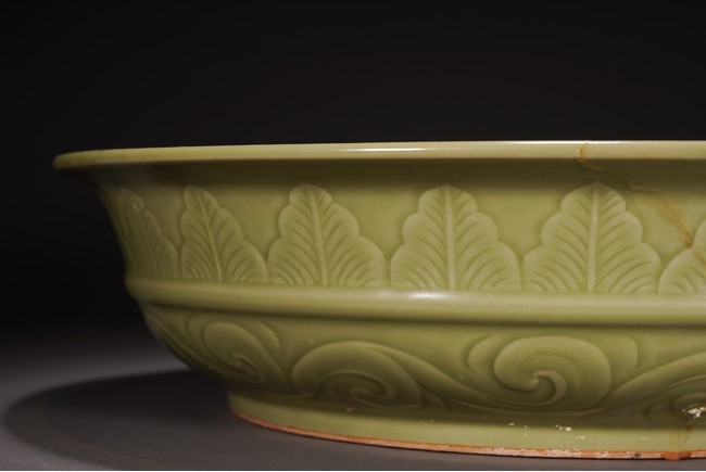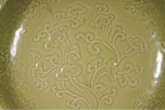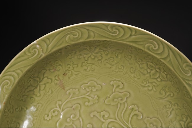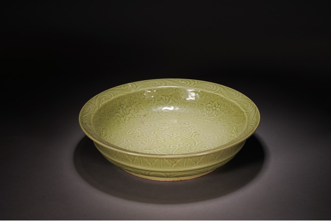 Chinese. THe interior decorated with lingzhi floral pattern, overall suffused in olive green glaze. Qing Dynasty period.