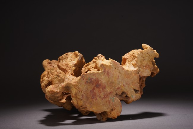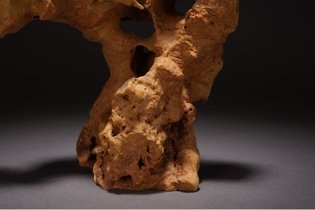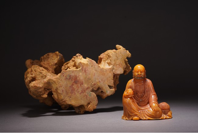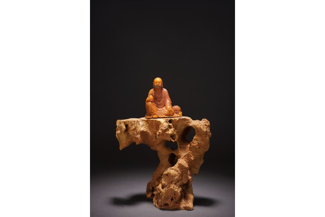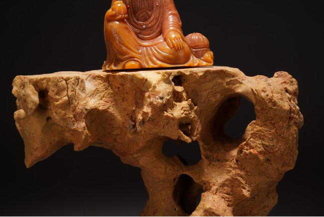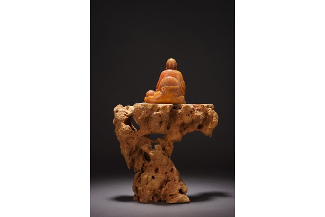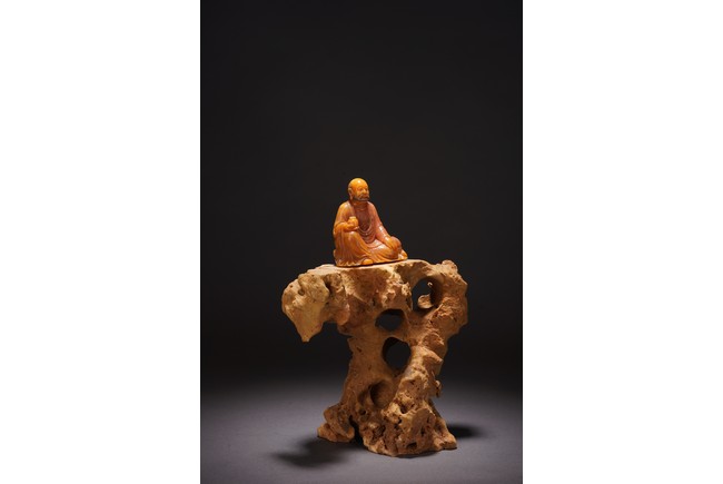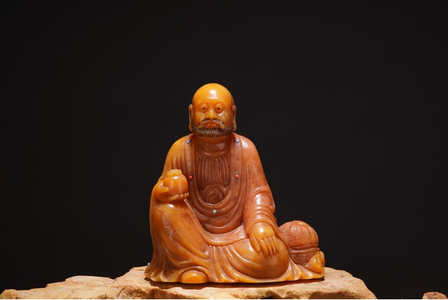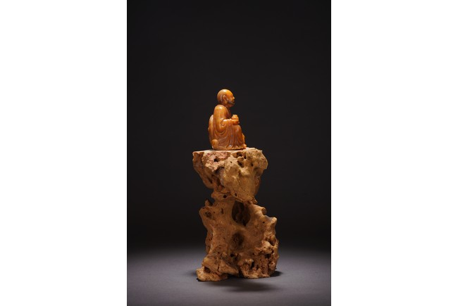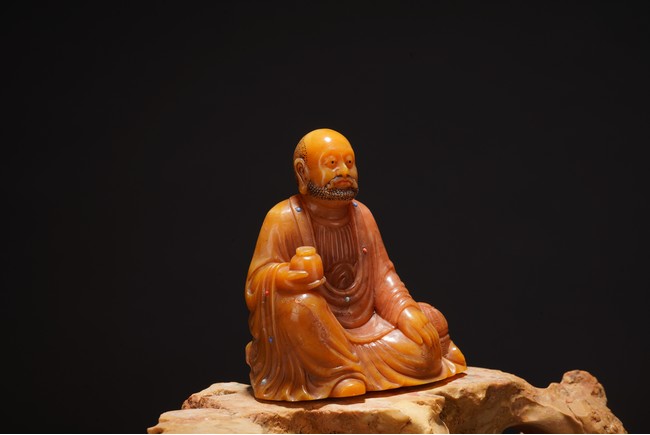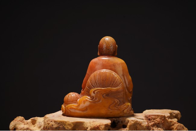 此件羅漢坐像石質通透,包漿溫潤。羅漢身著袈裟,雙目圓張,唇薄微挑,屈膝而坐,神態端祥,右手托缽,左手於膝旁,雙手獻桃,靈動之氣表現的淋漓盡致。羅漢衣褶處理的自然優美,質感表現充分。整件作品造型渾樸古拙,刀法嫻熟精湛,人物形像生動傳神,意境饒有情趣,是清代壽山石雕像的佳作,下為黃太湖隨型底座。