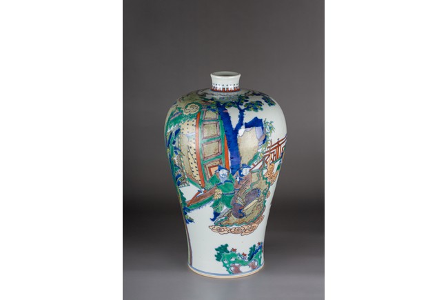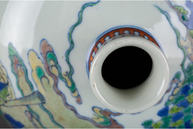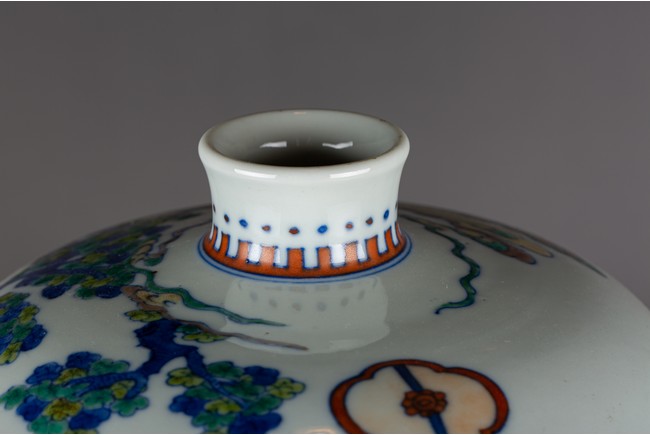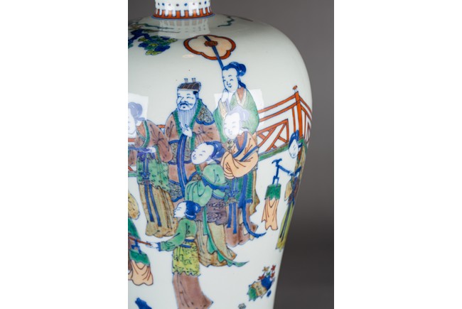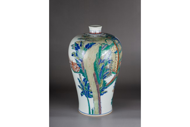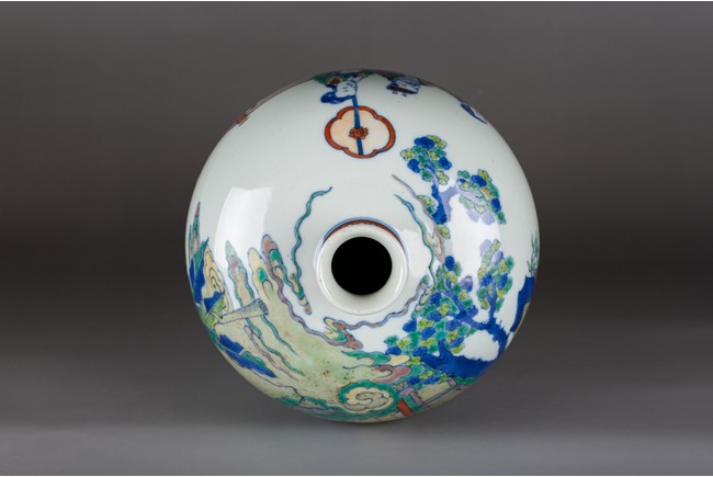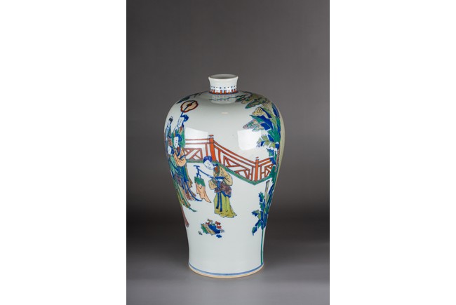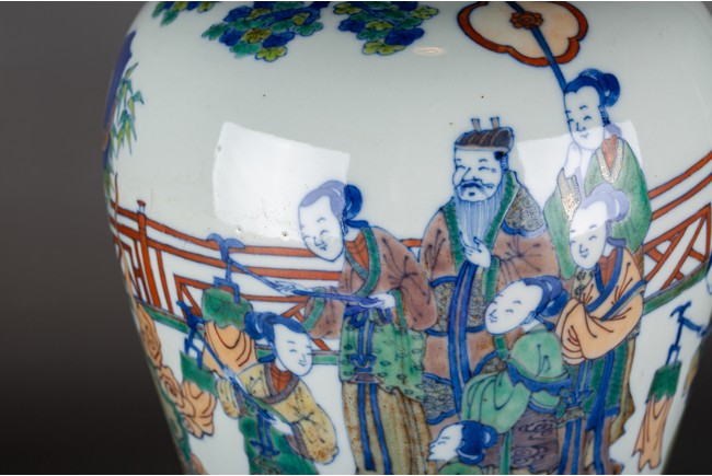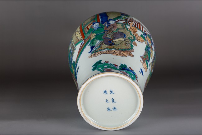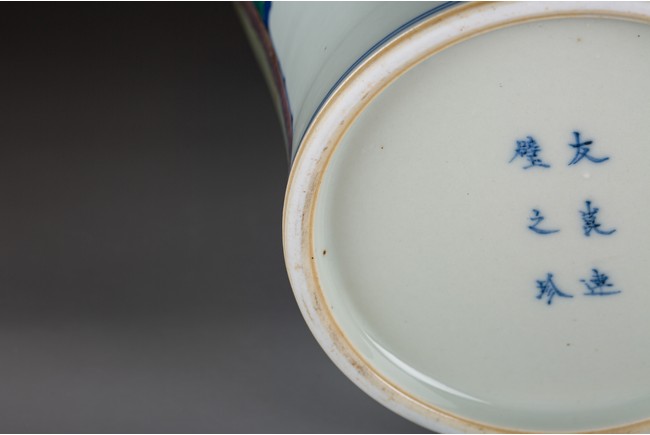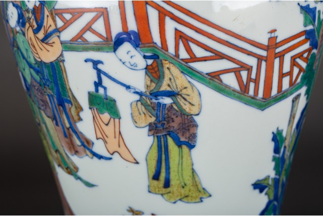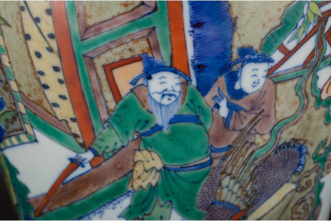 圓口,短頸,豐肩,鼓腹,腹漸下收,圈足。整器造型規整,製作精良,器形體高大,莊 重典雅,器身施鬥彩繪“人物”“仕女”“欄桿”“卷雲”“芭蕉”“山石”等,釉下青花 與釉上五彩爭奇鬥艷,令人賞心悅目。人物形態各異,刻畫傳神灑脫,繪法嫻熟,佈局得當, 緊密有度,層次分明,色彩豐富。 “友昆連碧之珍”青花款識。