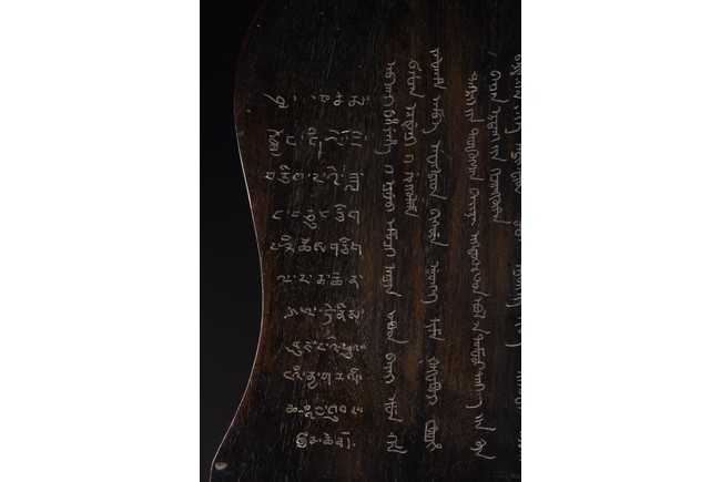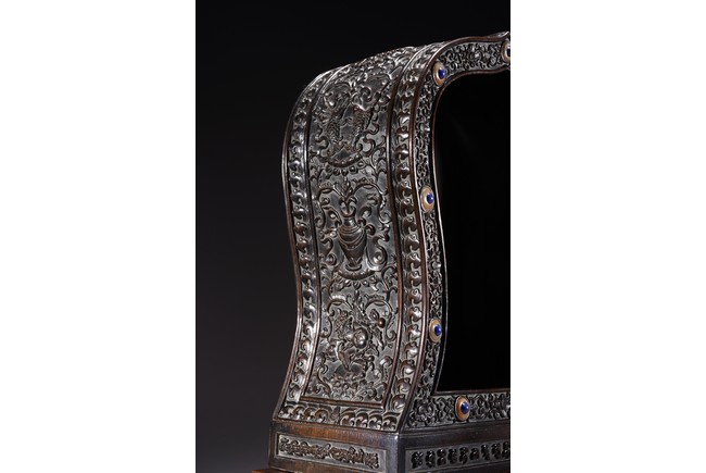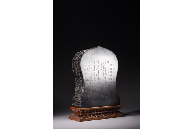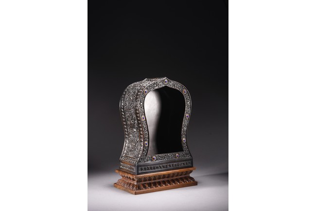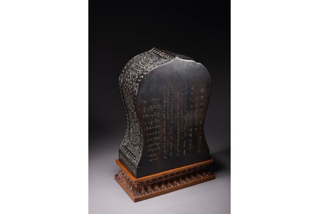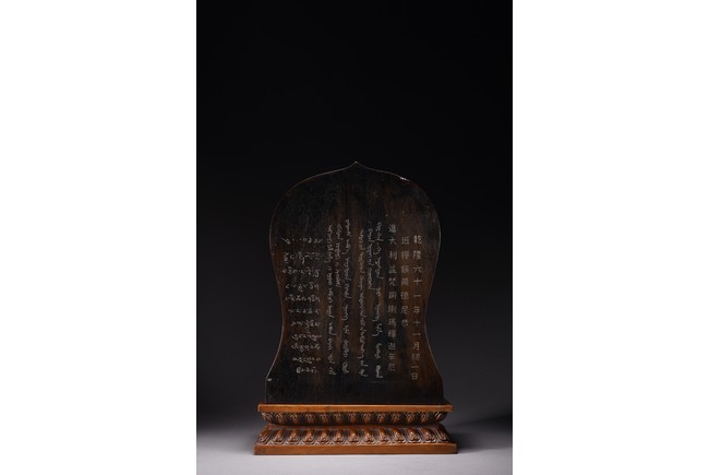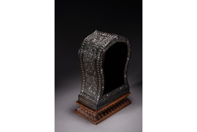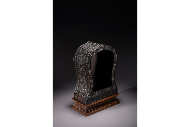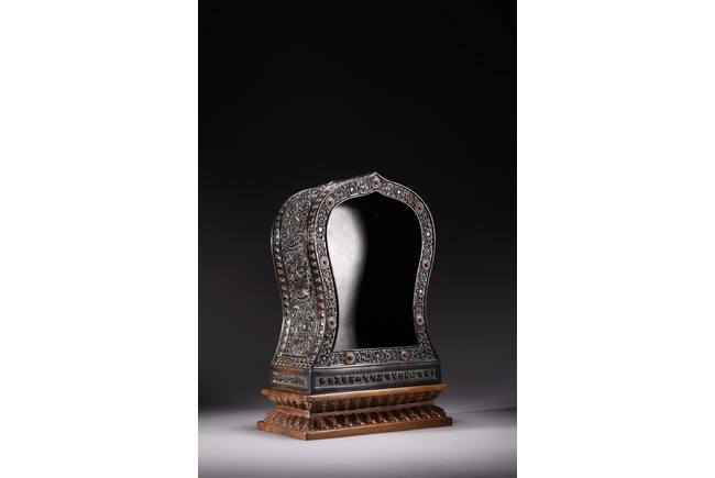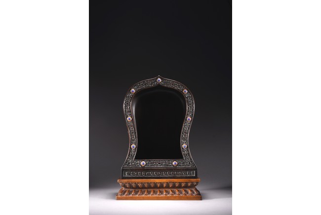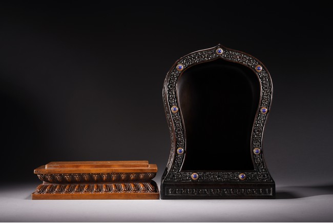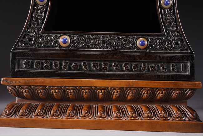 The zitan shrine is elaborately carved, the inner front frame decorated lotus scrolls and inlaid with beads, the sides decorated with raised eight buddhist treasures, the base with double lotus. The reverse finely inscribed in three scripts, including Chinese, Tibetan, and Mongolian, stating the date and purpose of making the shrine. Qing Dynasty period.