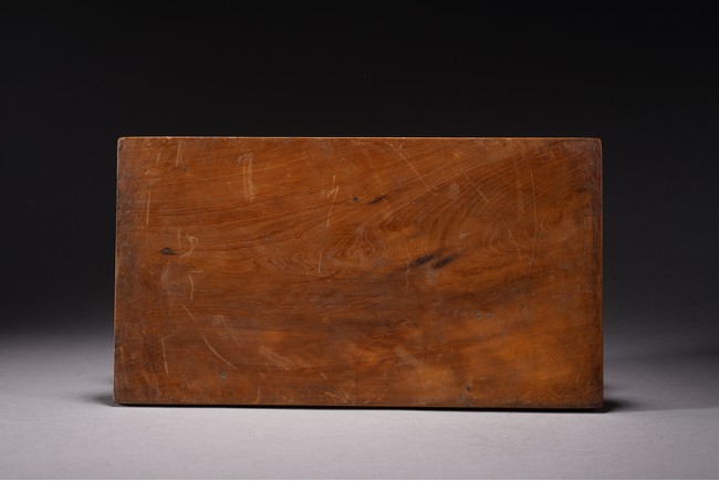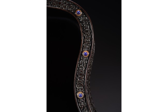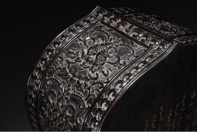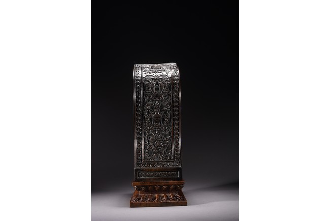 此佛龕以紫檀為材,由底座和佛龕兩部分卯合而成,造型秀氣,均用獨木雕琢。佛龕通體浮雕祥雲托佛家八寶紋和纏枝蓮紋,下承黃楊木雕蓮花寶座,浮雕仰俯蓮紋,與佛龕合璧,天造之作。製作規整,包漿醇厚。