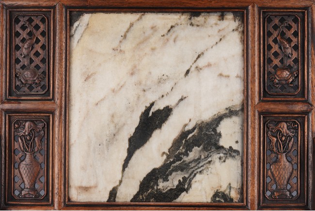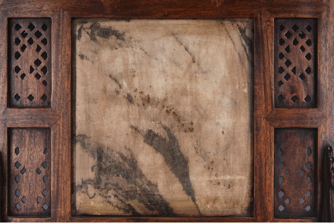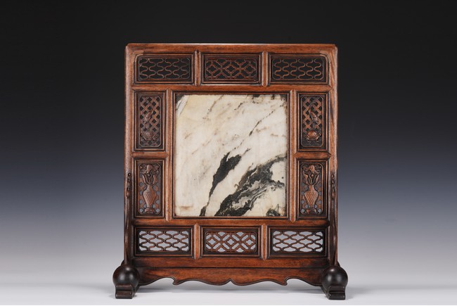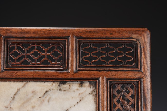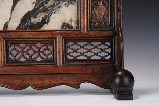 Chinese. The marble stone panel with attractive natural pattern set in a square frame enclosed by small rectangular panels reticulated with lattice to the top, flanked by two pairs of reticulated panels carved in relief with cranes and flower vases. Qing Dynasty period.