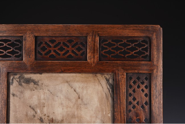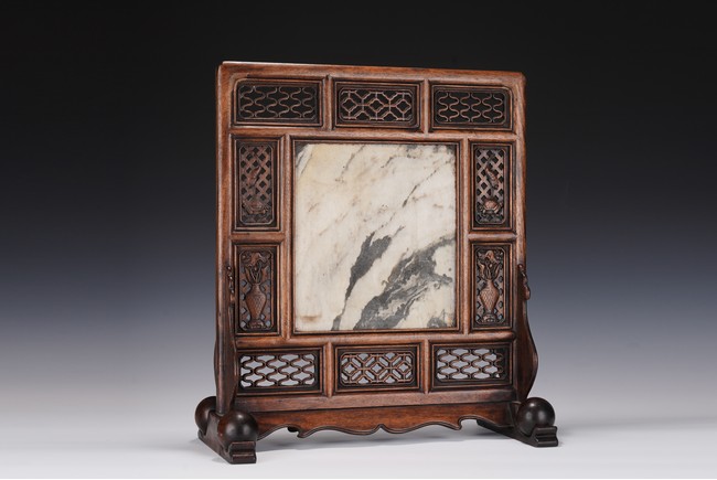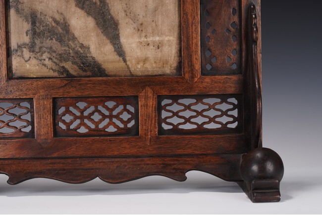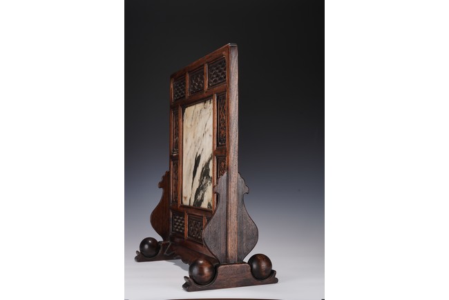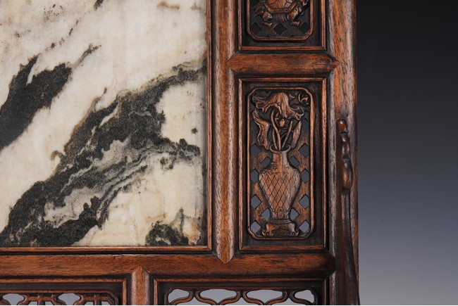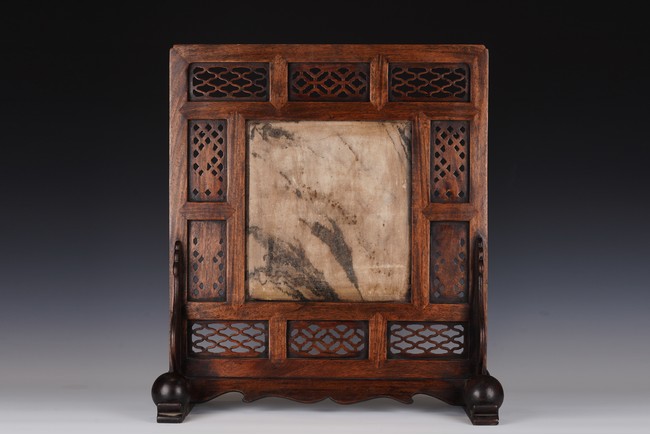 此例與大座屏風造法相同,尤其是屏風邊框內的分隔,將屏心上、下皆分為三塊絛環板,兩側則各豎分為兩塊。紫禁城景仁宮的明代石照壁,便是這種形制。此黃花梨座屏絛環板內嵌大理石,紋理美觀。墩子上造出抱鼓蕖花安站牙,古意甚濃。