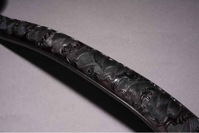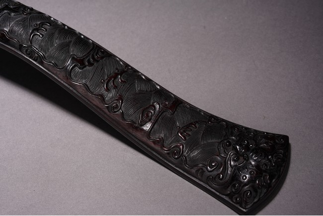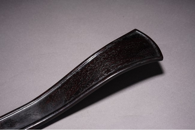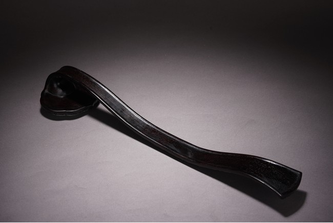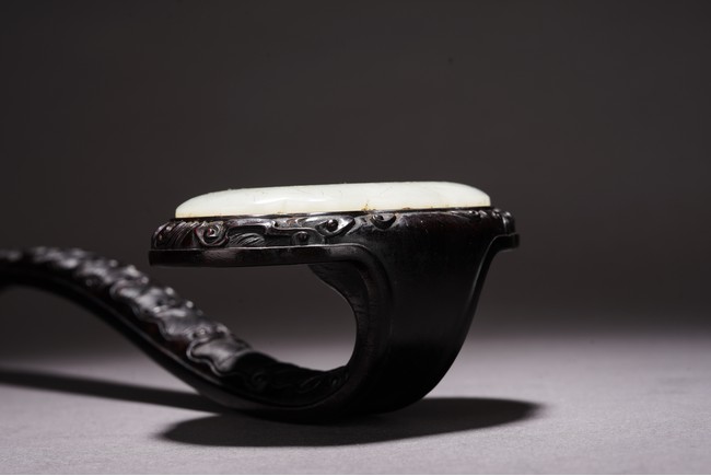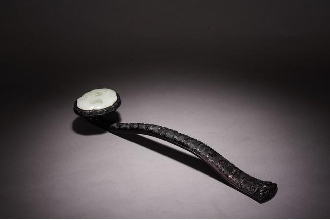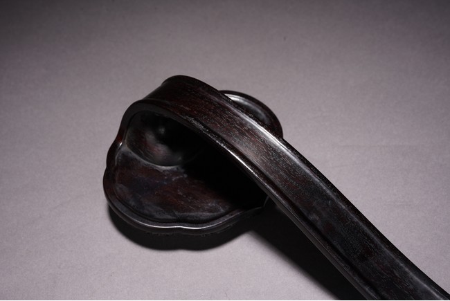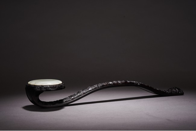 如意是一種陳設器物,由古代寺院中僧侶所用的搔癢之物逐漸演變而來,象徵著如意吉祥,是富貴人家的賀壽禮物之一。從靈芝與如意的形狀上看來十分的相似,如意的形狀和涵義正是從靈芝演變過來的,作為祈求平安幸福的吉祥物。此柄紫檀嵌玉如意為標準如意造型,雕琢華美細膩,取紫檀一截,精工細作,雕就如意之形,形態自然,外表打磨光潤、更顯清雅靈動。