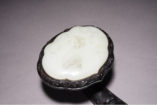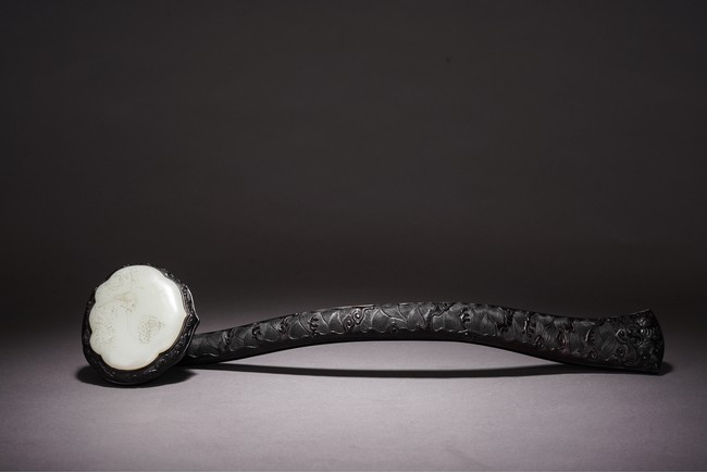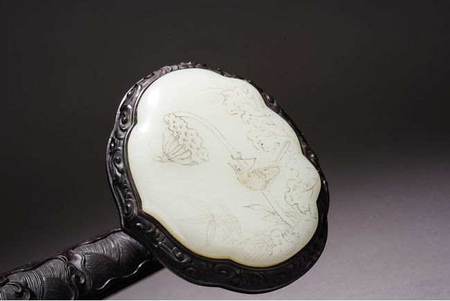 Chinese. The ru yi head embellished with white jade panel incised with a bird perching on lotus stem, supported on the curved handle carved in shallow relief with cloud and waves. Qing Dynasty period.