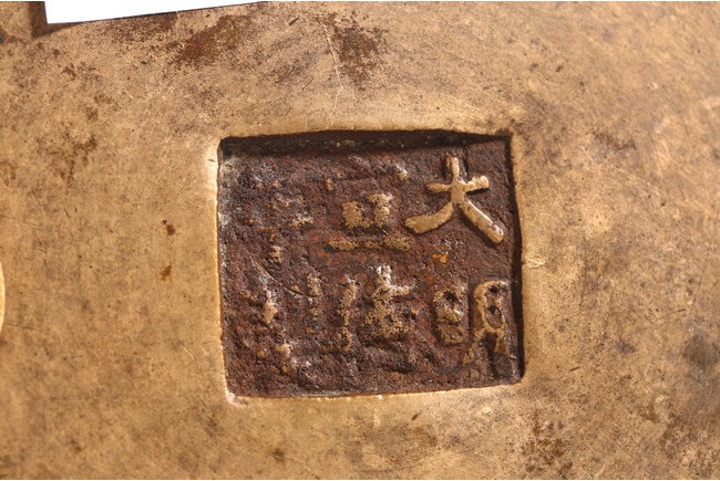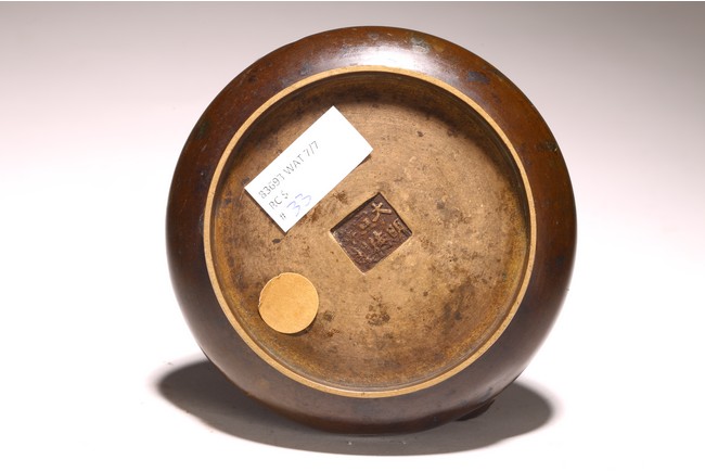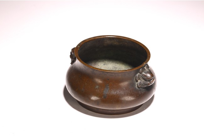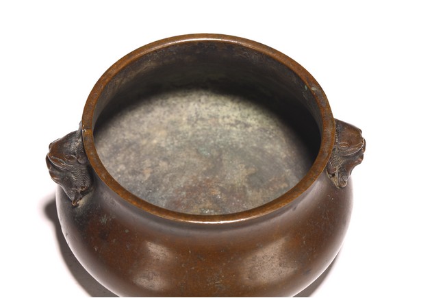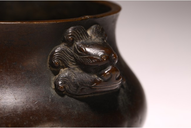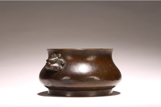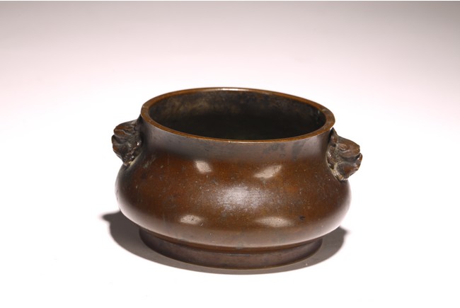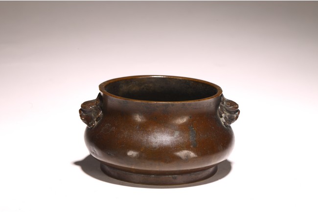Chinese. Cast with a compressed globular body rising from a short foot to a gently flared rim, set with a pair of lion-head handles, the base with an apocryphal inscription in a recessed square, the patina of a warm brown color. 17th century. Early Qing Dynasty period.