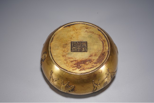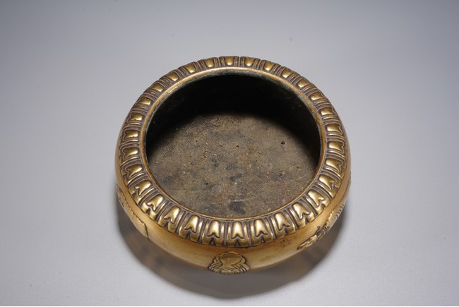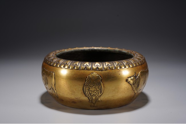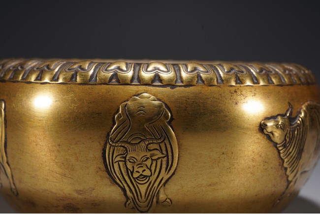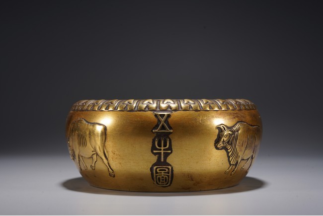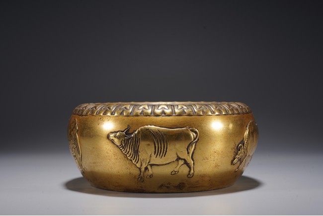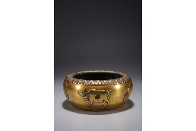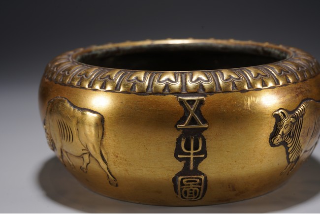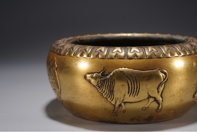 爐呈缽式,口內斂,精作單蓮瓣紋一周,溜肩,垂腹下收,平底圓足,器腹精作高浮雕五牛圖,刻畫細膩,各具形態,入手沉墜,文房佳器。