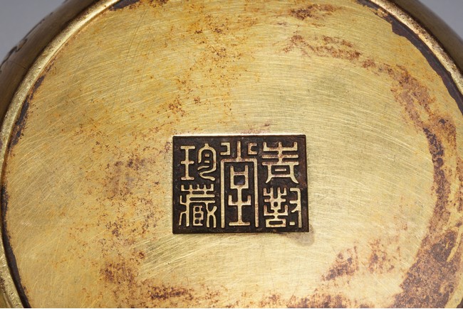 Chinese. The compressed globular form body cast in relief with five buffalos,the mouth rim encircled with lotus petal formed decorations, the base with five character mark.