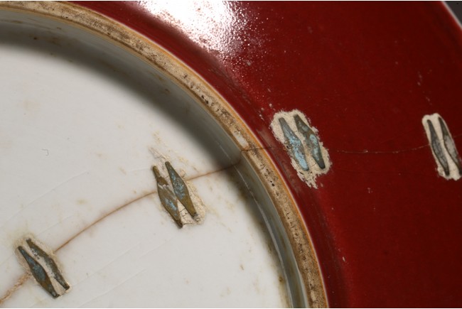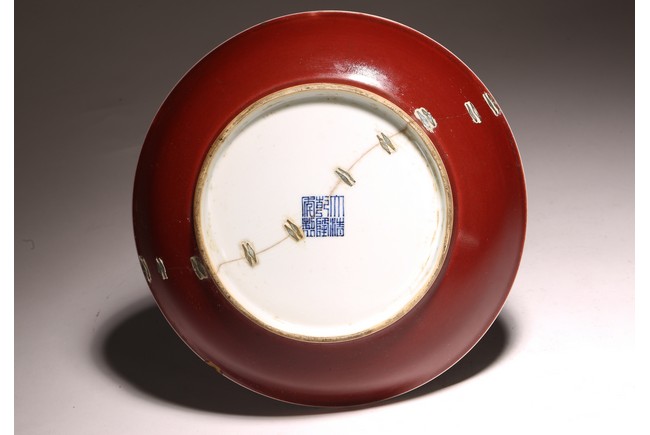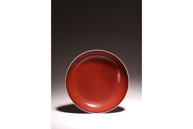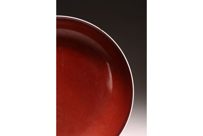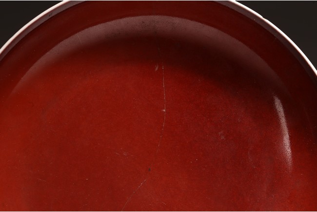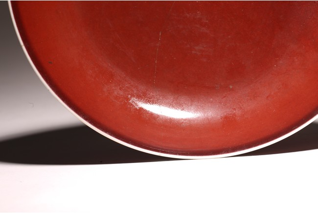 圓口,弧壁,下承圈足,釉質瑩潤,足端露胎,通體施紅釉,鮮紅艷麗。 “大清乾隆年制”款識。殘了,帶老補痕跡。 來源:密蘇裡州堪薩斯城私人收藏 Provenance: Property from a Kansas City, Missouri Family Estate