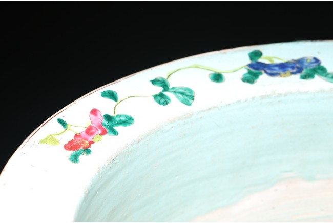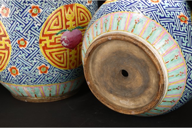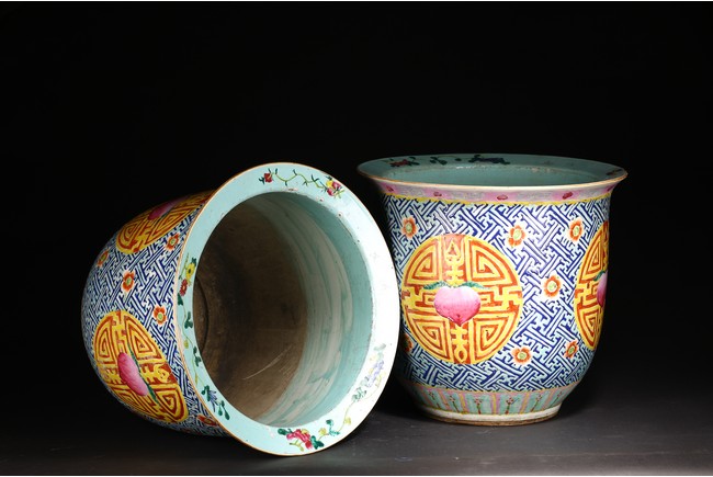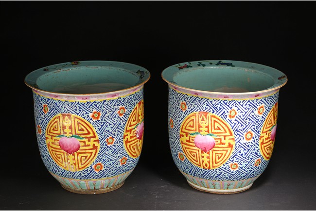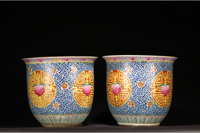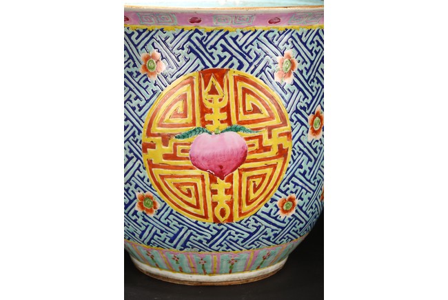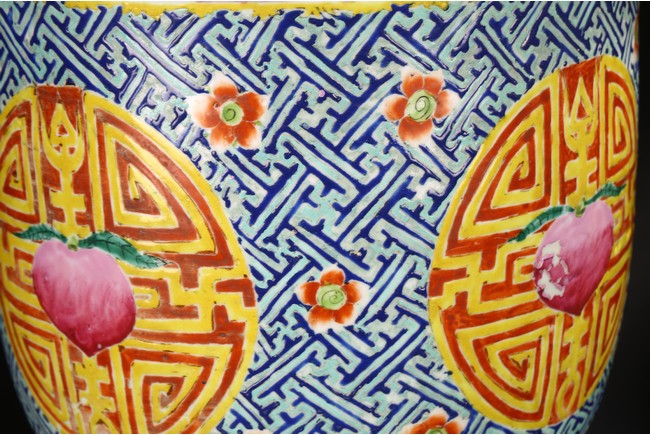 Chinese. Of inverted bell-form, the body painted with peaches within 'shou' medallions reserve upon dense key-fret ground, the mouth rim decorated with floral sprays. Republic period.