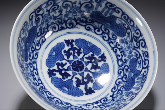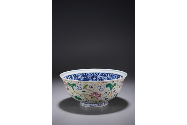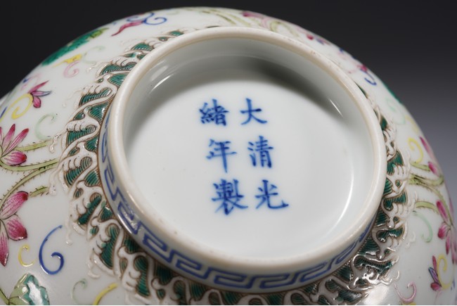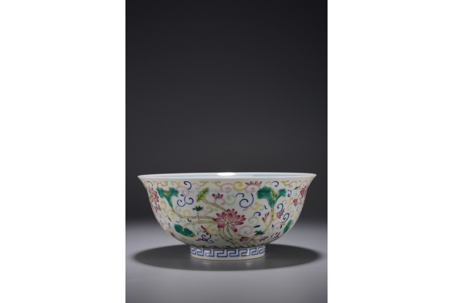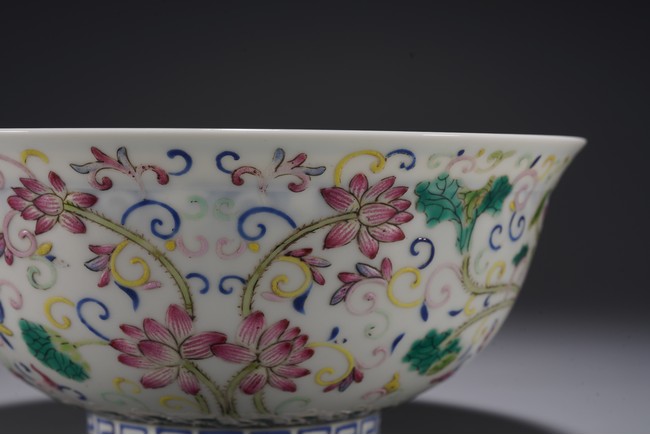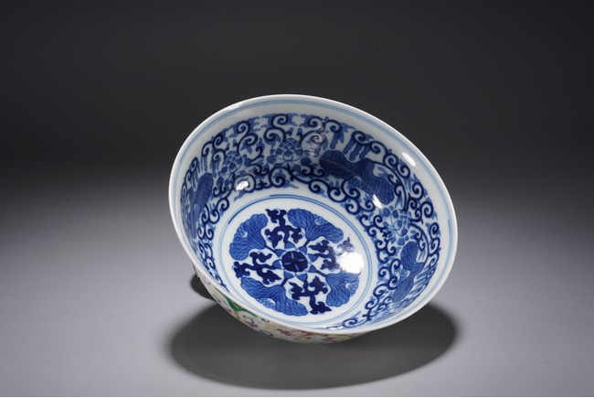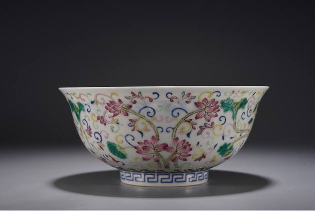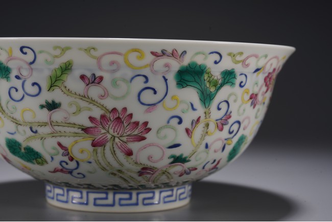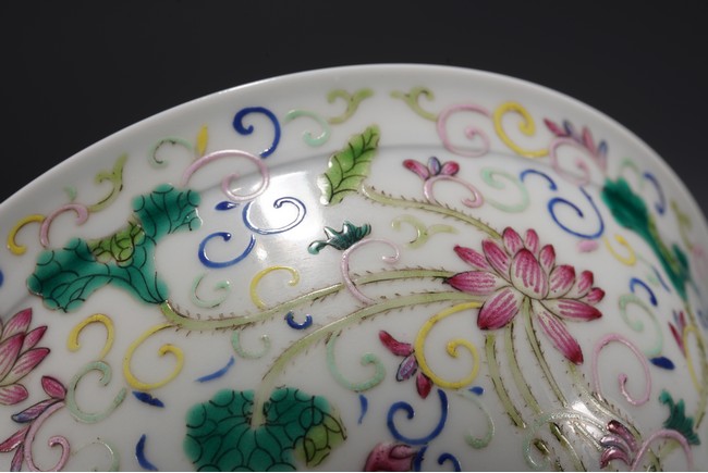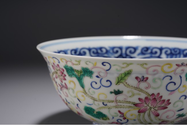Chinese. The exterior finely painted in famille rose with floral scrolls, the interior painted with stylized scrolls and a large lotus mendallion to the center.