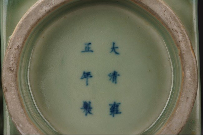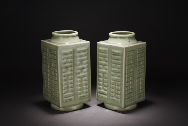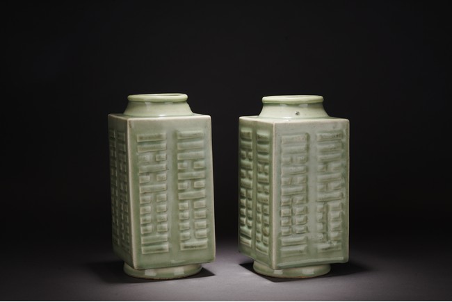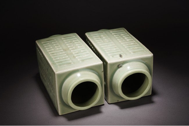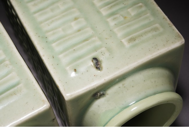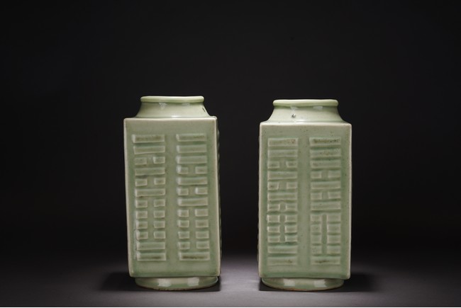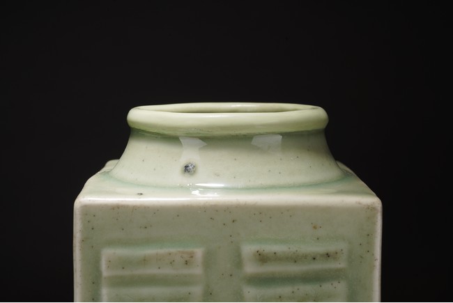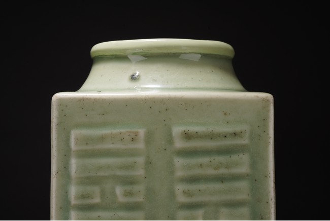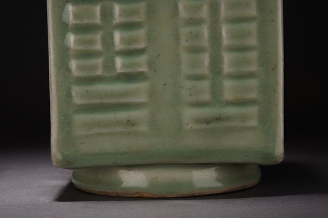 瓶仿玉琮造型,小口,短頸,折肩,方形直腹,圈足。通體滿施粉青釉色。外壁四面各凸起八卦紋。釉面肥潤,釉色青中淡雅,通體純淨。琮式瓶始出於南宋,宋代盛行仿古之風,這種瓶式系仿照周代玉琮外型並加以變化而成,古樸而雅緻。