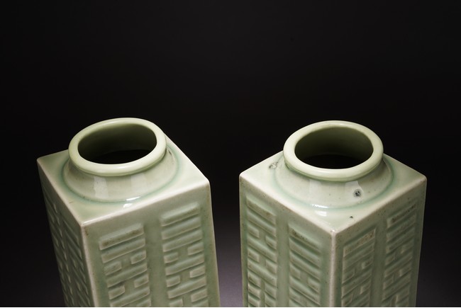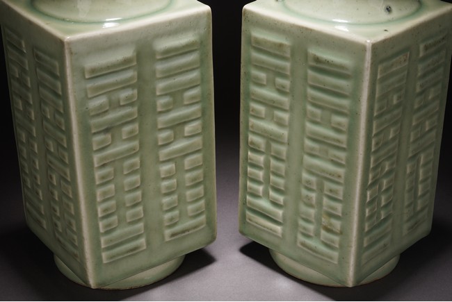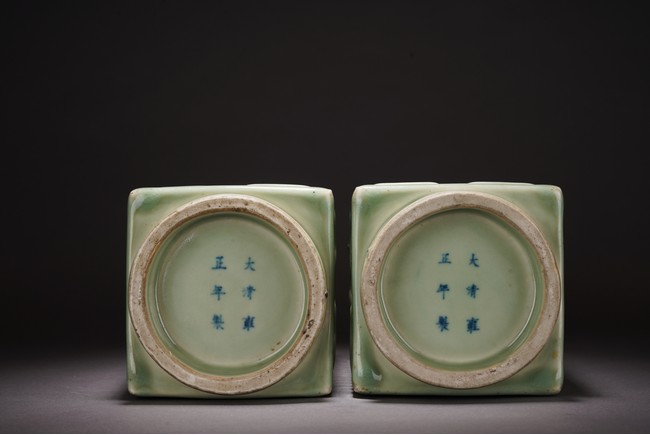 Chinese. Each with the body of square section rising from a short straight circular foot to a tapering circular neck with a lipped rim, molded with the bagua (Eight Trigrams) to each of the four sides, covered overall in a lustrous celadon glaze, the base with six-character mark in underglaze blue