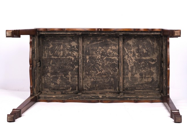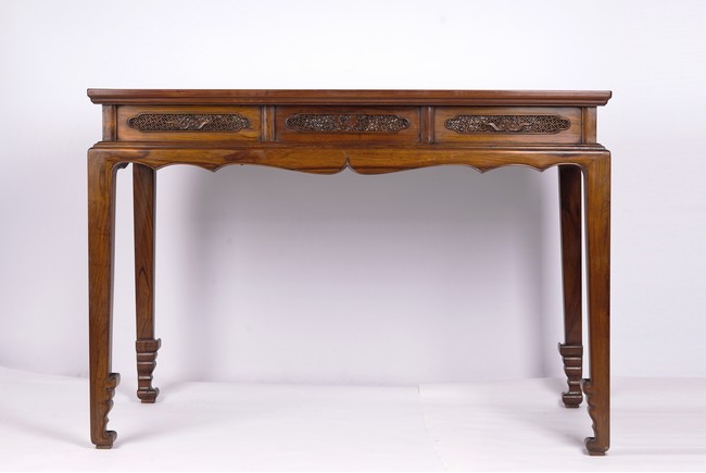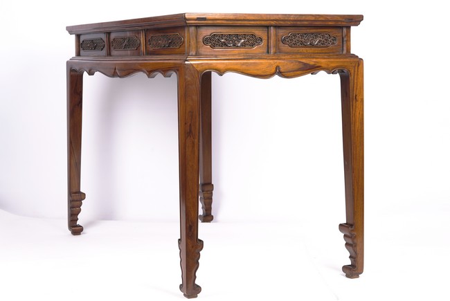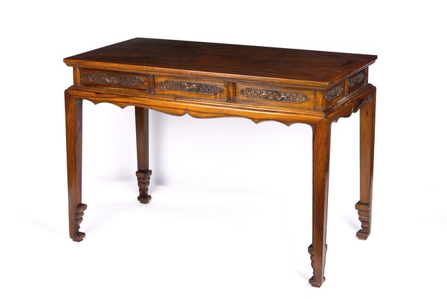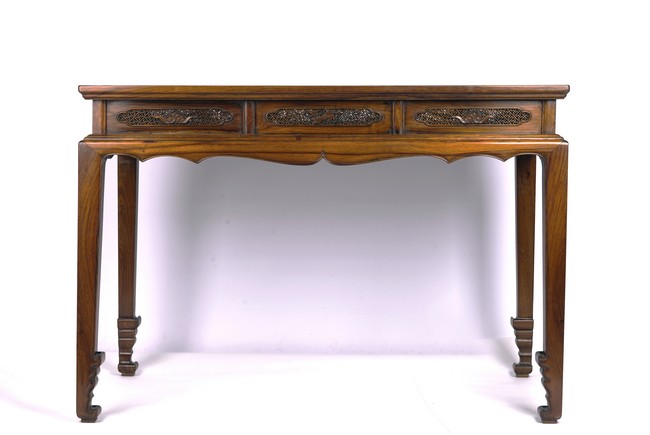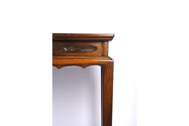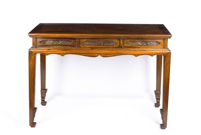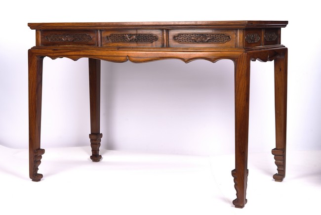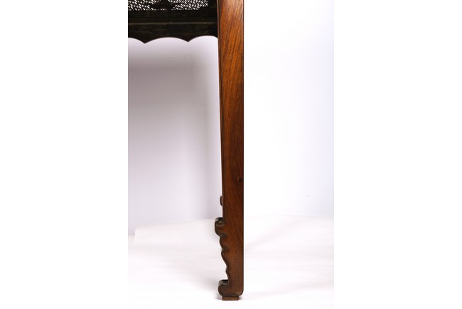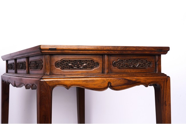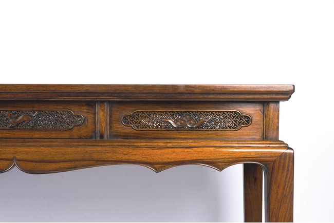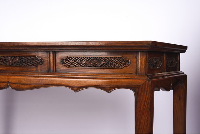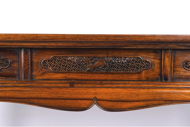 此桌通體選用海南黃花梨製成,堅實細膩,色澤光潤典雅。桌面攢框鑲光素獨板,充分突出海南黃花梨天然的紋理美感與光澤度,其上透雕萬字紋;劍腿,跟足成雙棖,另端與家具面子底部連接,整體器型大方,用料考究,最能彰顯文人氣質。 來源:佛羅裡達私人收藏 Provenance: From a private Florida collection