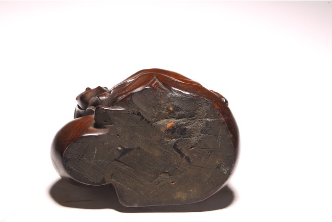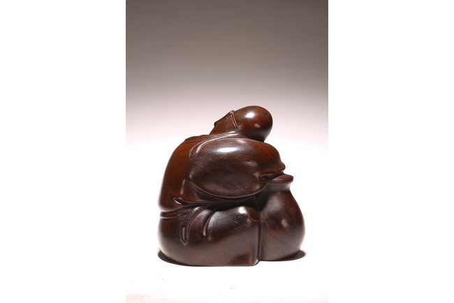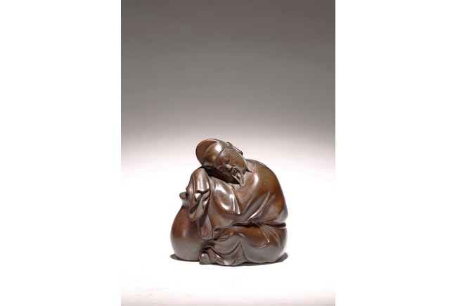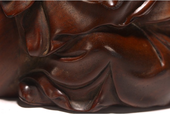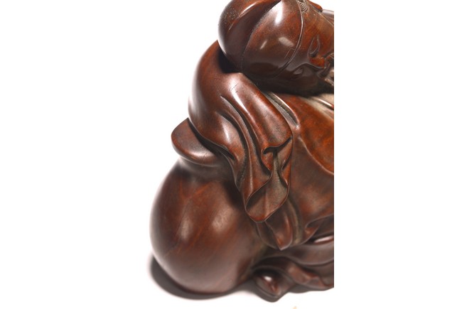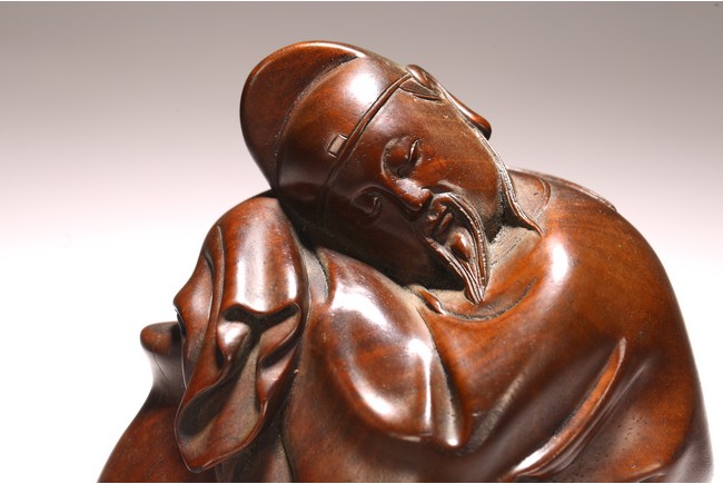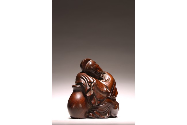 黃楊木製成,包漿厚重,呈紅棕色,有古樸典雅、天然尊貴之美感。人物細長眉,杏眼微閉,長須飛揚,頭戴官帽,身著長衣,倚靠在酒壇上。雕刻手法細緻,人物活靈活現,生動形象。 來源:加利福尼亞州蒙特利公園教授收藏 Provenance: Property from a profesor's collection, Monterey Park, California