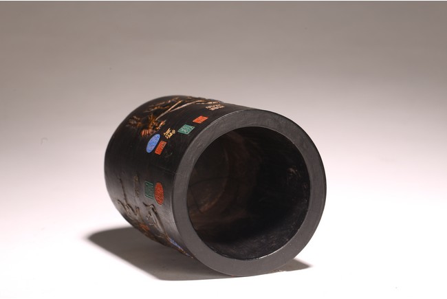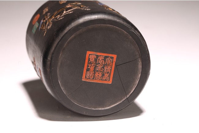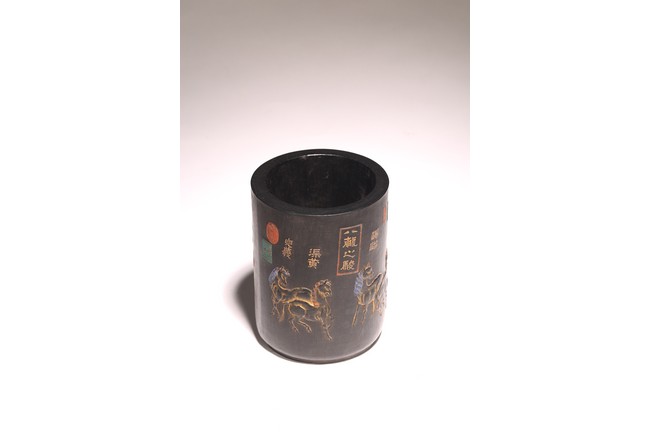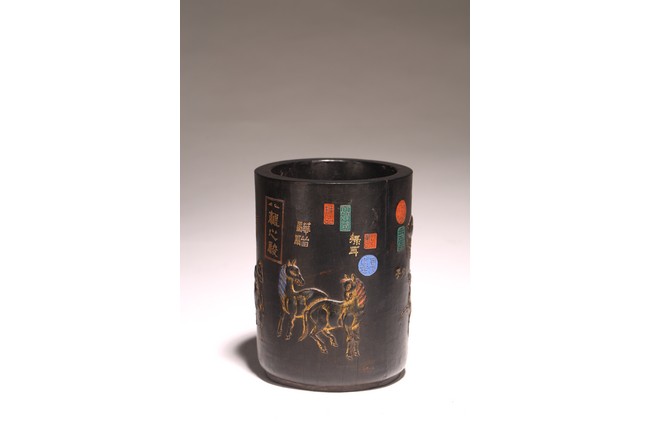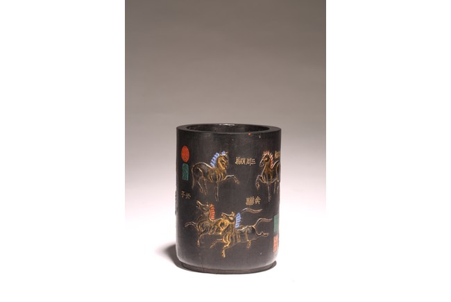 Chinese. Of cylindrical form, the body moulded with horses with corresponding names and seal marks, the base inscribed with mark. Qing Dynasty period.