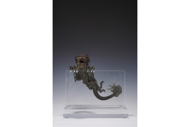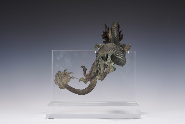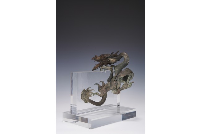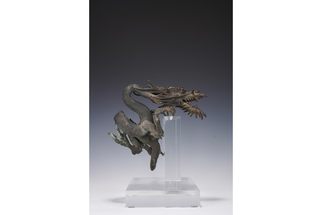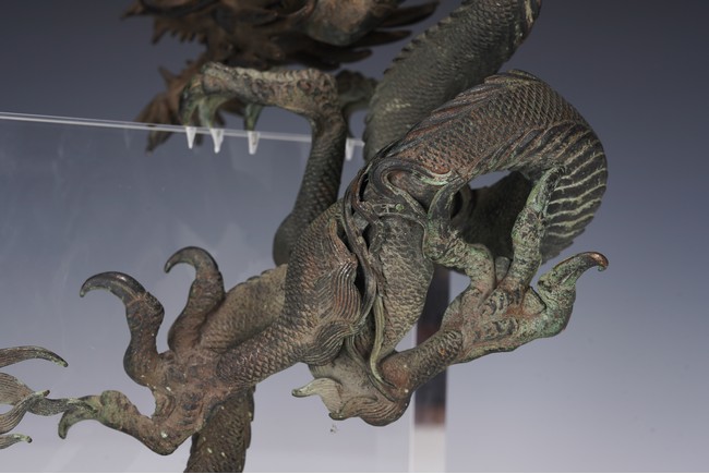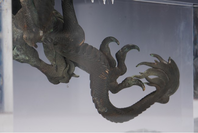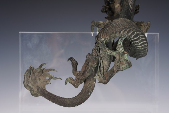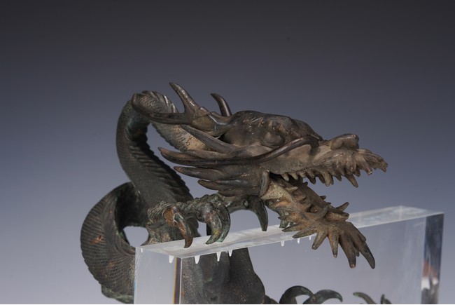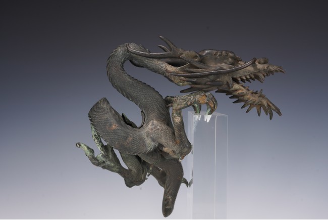 Japanese. A bronze dragon clutches with his three claws, the expressive dragon with open mouth showing his teeth and tongue, long whiskers and horns aim back over his body. Edo Period.