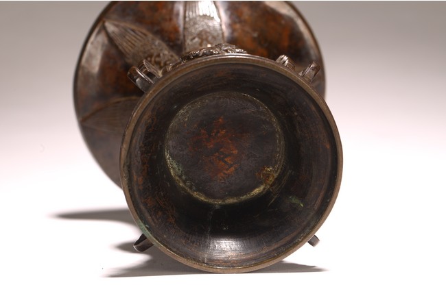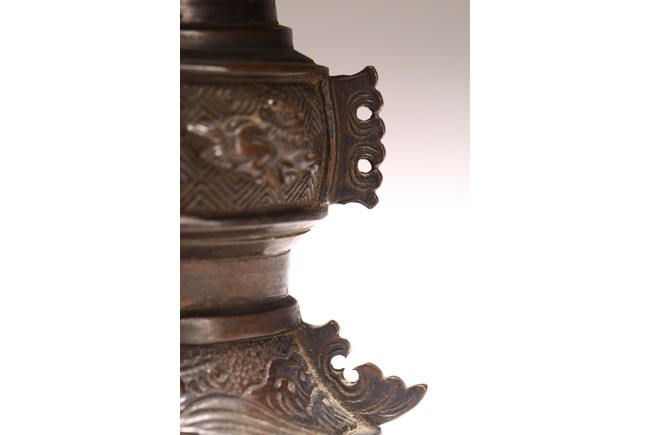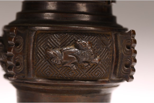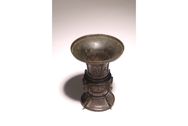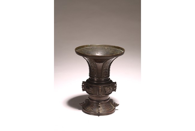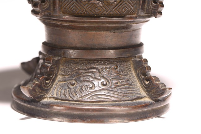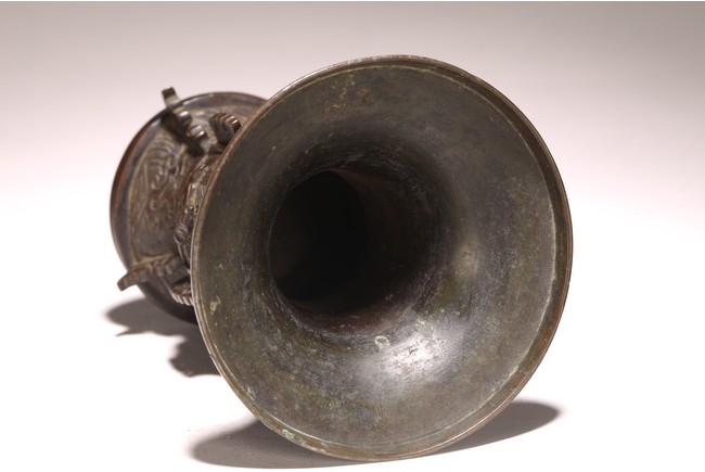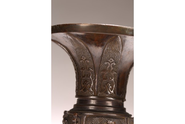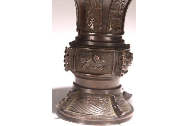 型仿自商周青銅觚,原為五供之一。器形古雅而秀逸,喇叭口,束頸,近底漸外撇,淺圈足。器身雕刻“迴紋”“獸紋”“海水紋”,佈局熱鬧繁密,形象鮮活靈動。整器造型規矩大方,紋飾刻畫精細,銅質優良,為陳設佳品。 來源:密蘇裡州堪薩斯城私人收藏 Provenance: Property from a Kansas City, Missouri Family Estate