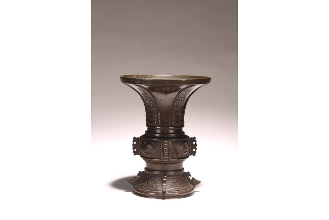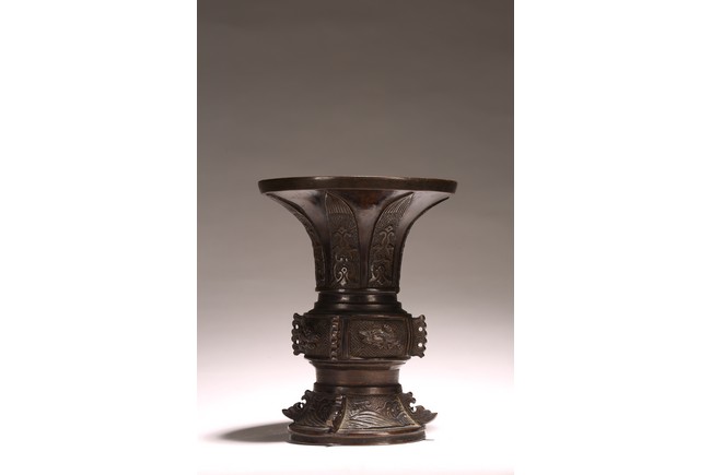 Chinese. Of archaistic gu form, the boulbous body cast in relief with mythical beasts divided by raised flanges, the flared neck decorated with cicada blades. Ming dynasty period.