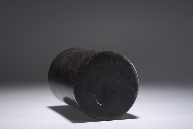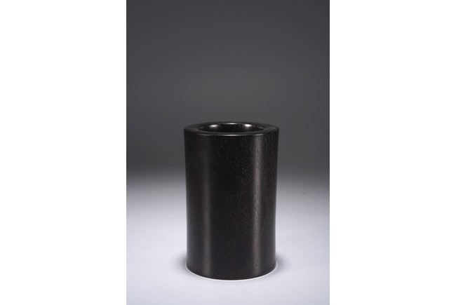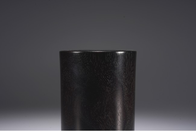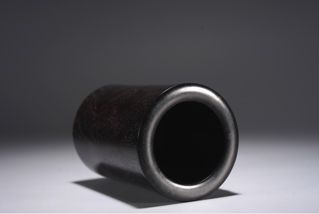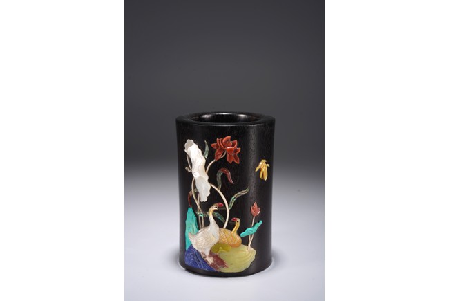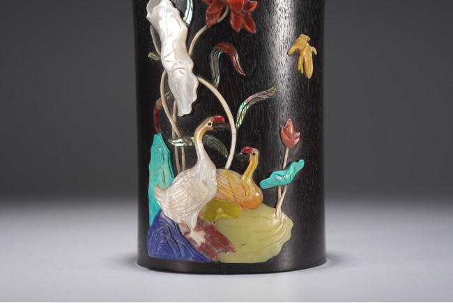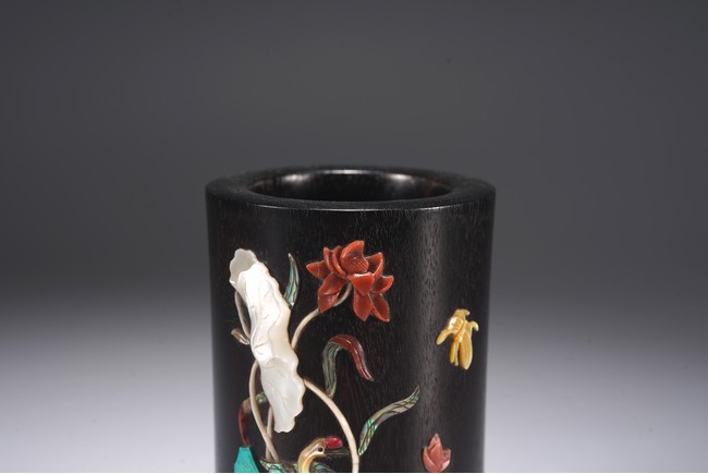 此筆筒在紫檀深沉的色地上施以五彩繽紛的百寶嵌工藝,鮮麗而不失雅緻,紫檀與百寶嵌花鳥形成對比互襯,各種色澤與紋理的百寶鑲嵌組合亦相映成趣。