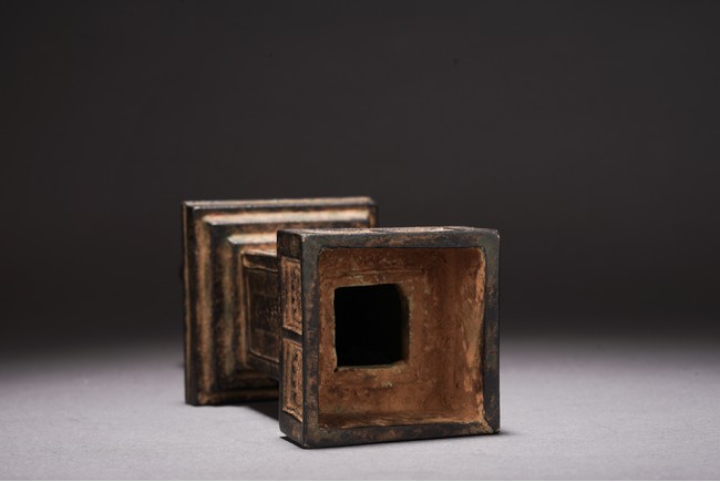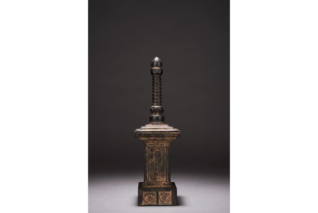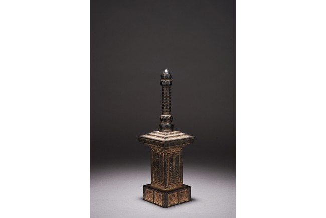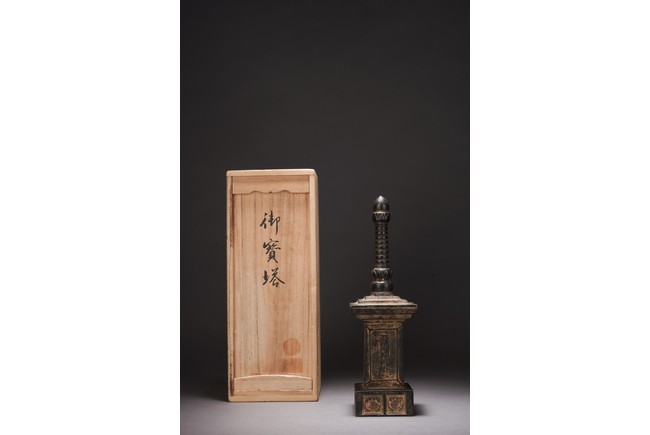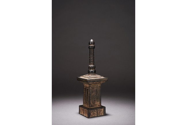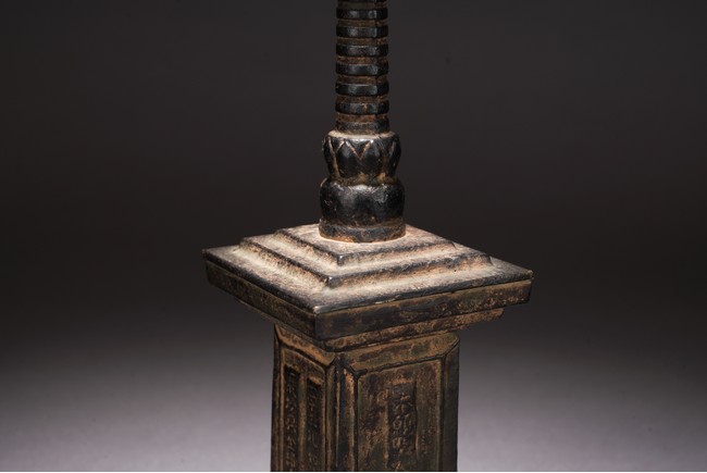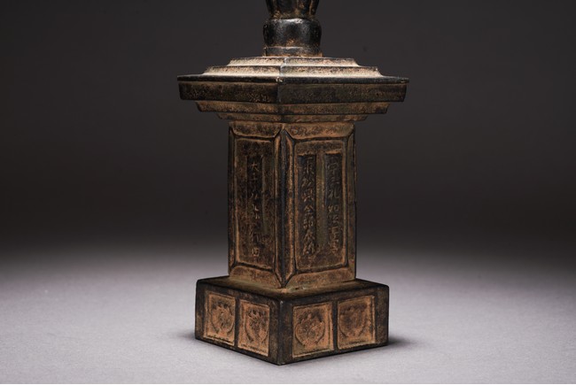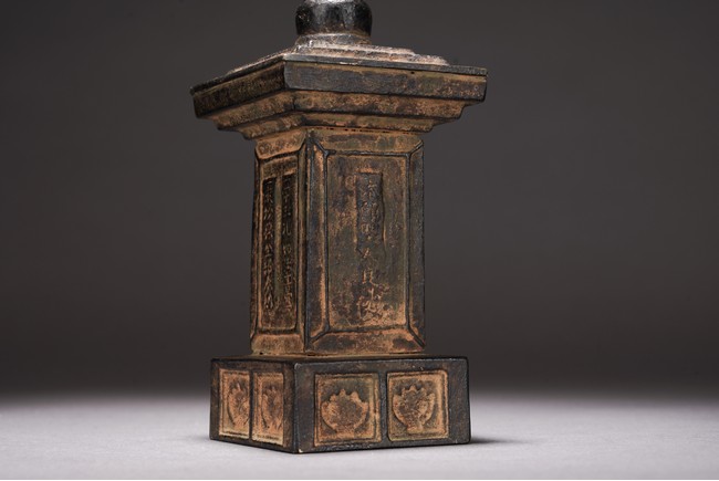 Chinese. The pagoda cast with rectangular body with inscriptions and tall cylindrical finial. Qing Dynasty period.