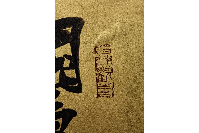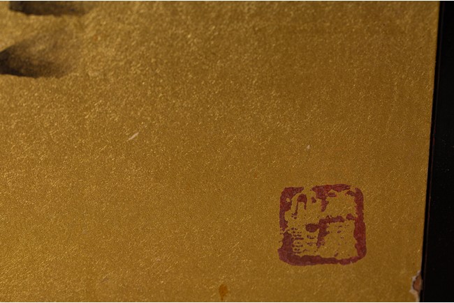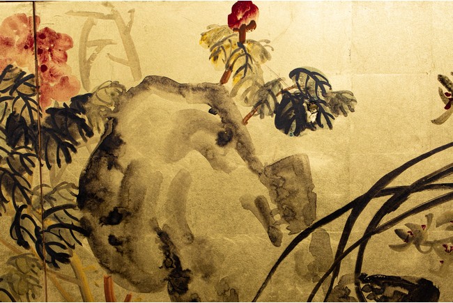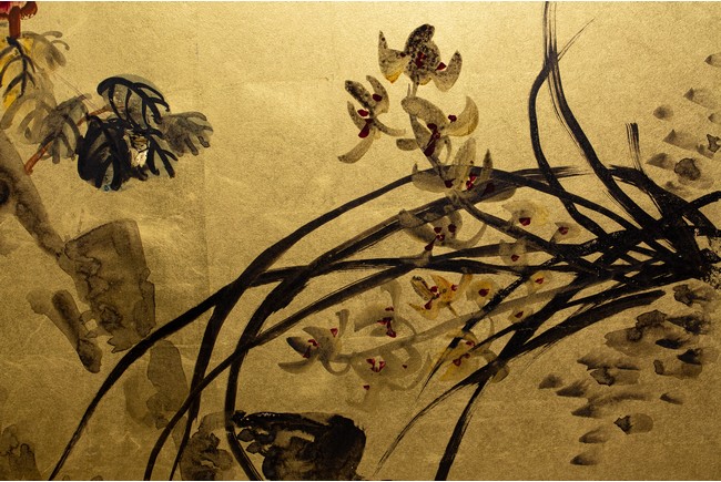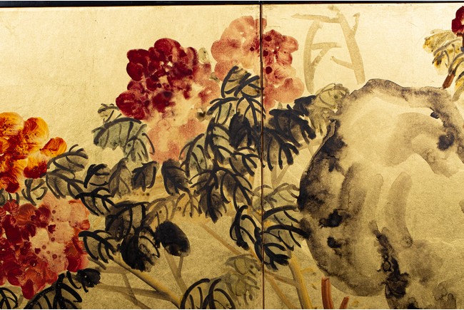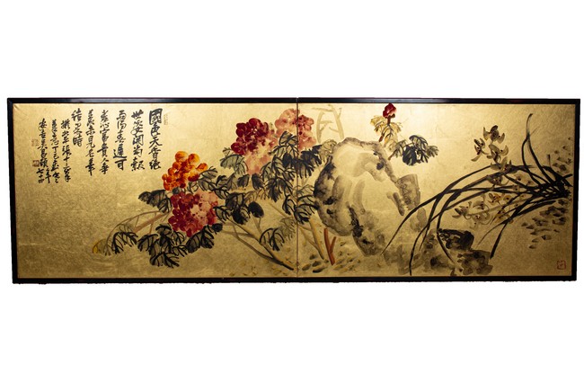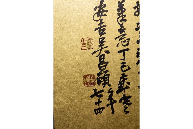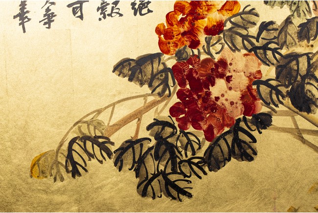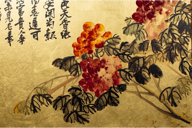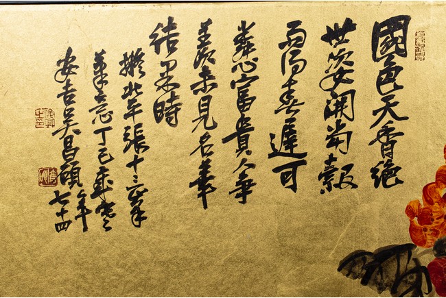Chinese. Color and ink on golden paper. Flowers. Inscribed and signed Wu Changshuo with three seal marks. Framed.Width: 68 1/8 in (173 cm) Height: 22 1/4 in (56.5 cm)