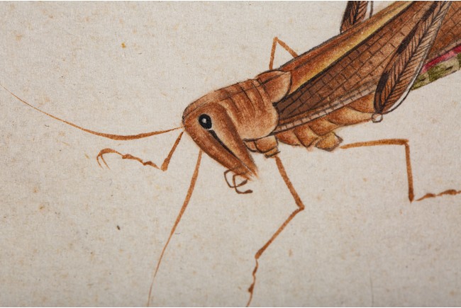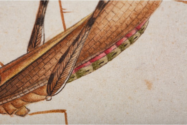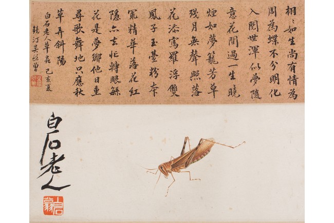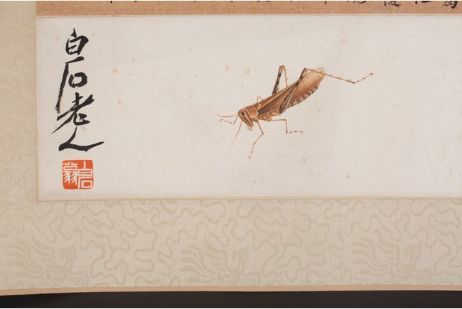 Chinese. Color and ink on paper. unframed. mantis. signed Bai Shi Lao Ren, with one seal mark. with calligraphy signed Jing Ding with one seal mark.