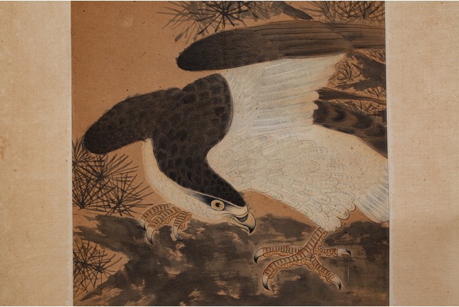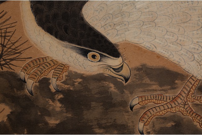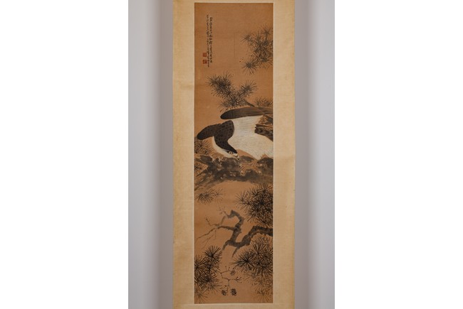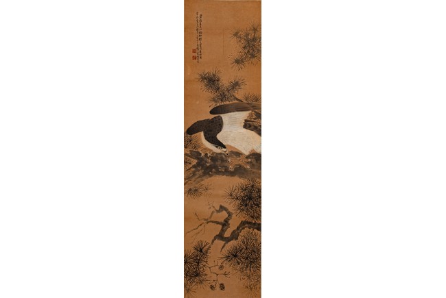 Chinese. Color and ink on paper. Hanging scroll. Eagle. Inscribed and signed with two seal marks. Attributed to Gao Qifeng.