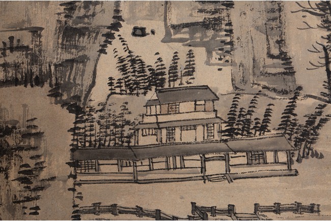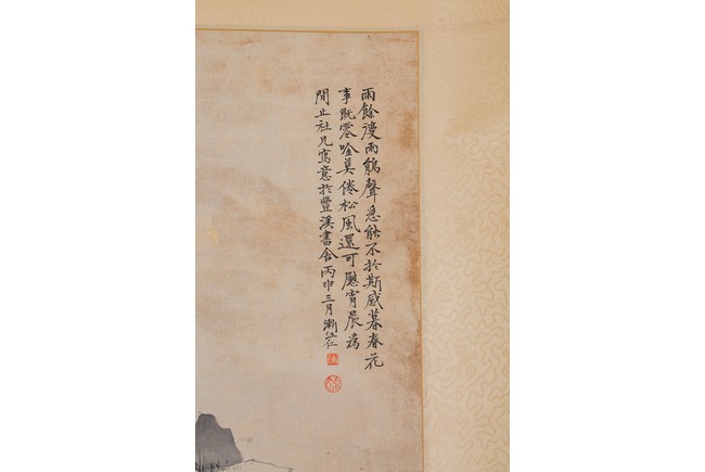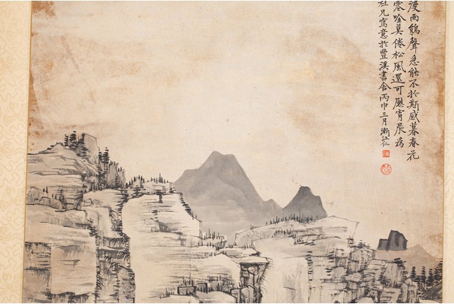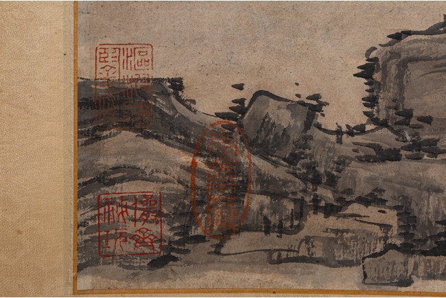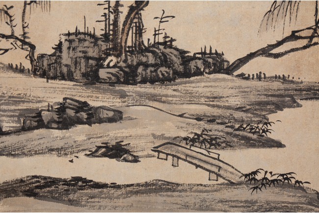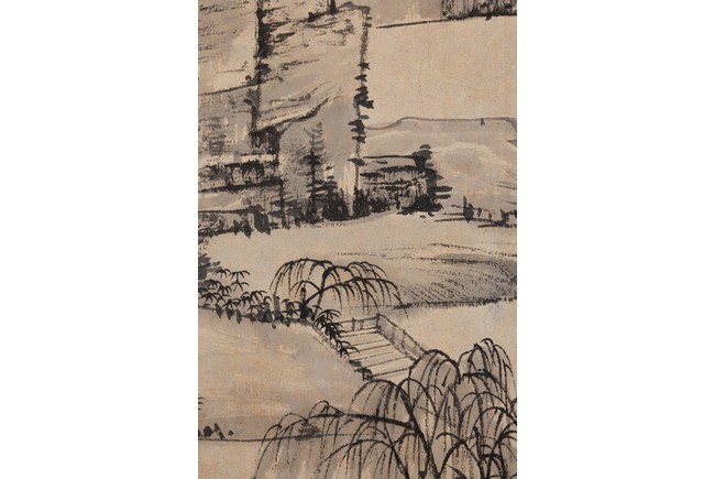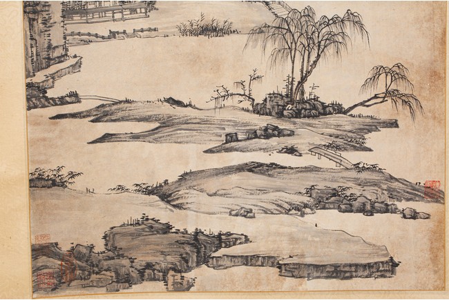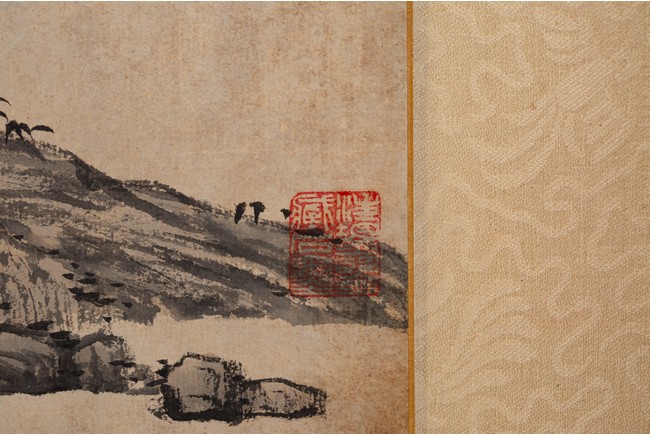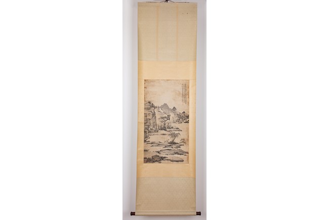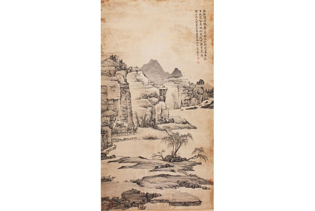 Chinese. Ink on paper. Landscape. Inscribed and signed with three seal marks. Hanging scroll. Attributed to Hong Ren