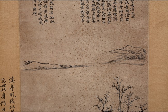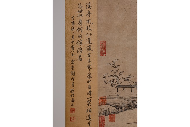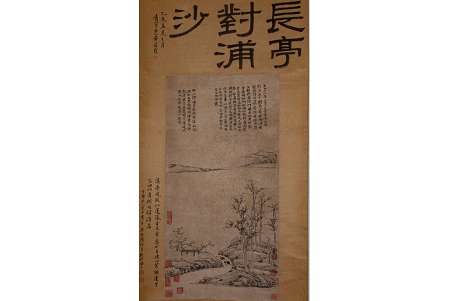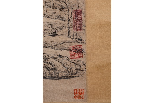 Chinese. Ink on paper 'landscape'. Hanging scroll. Inscribed and signed with various seal marks. In the style of Ni Zan.