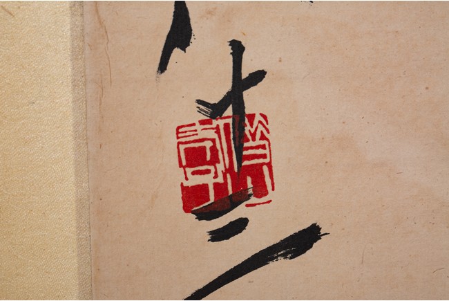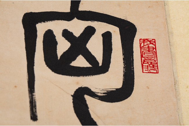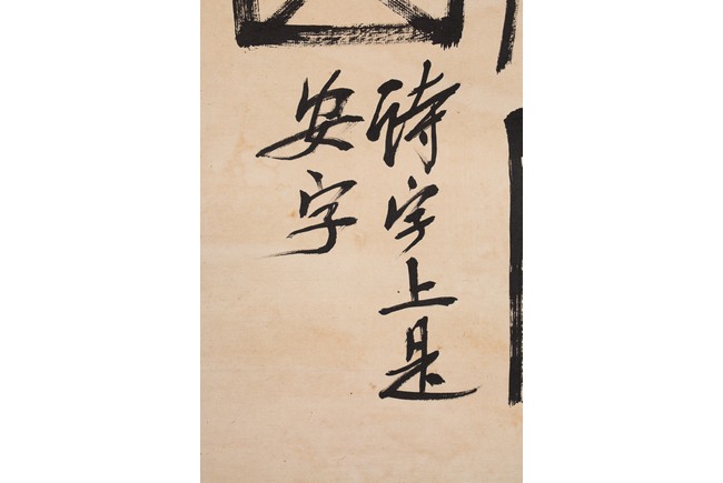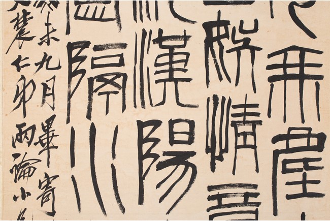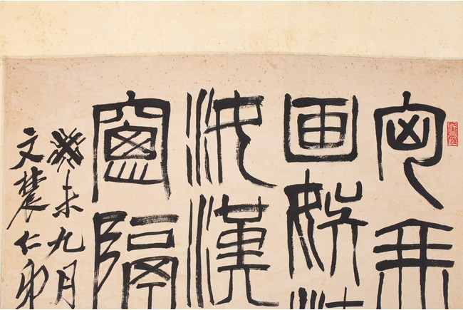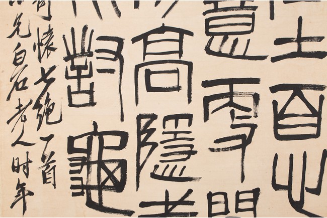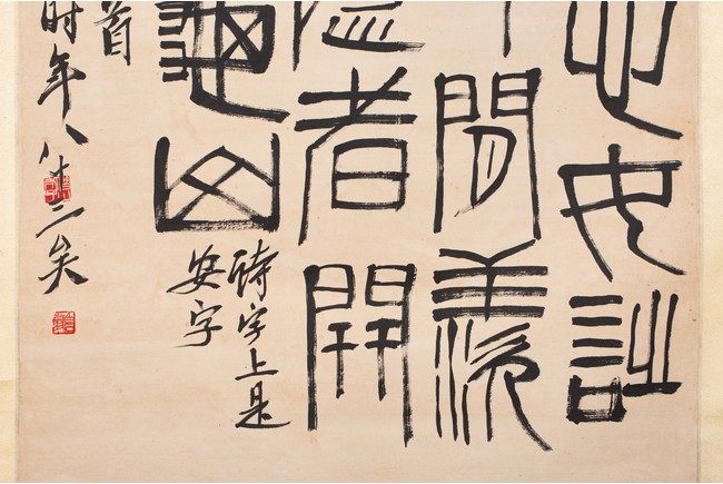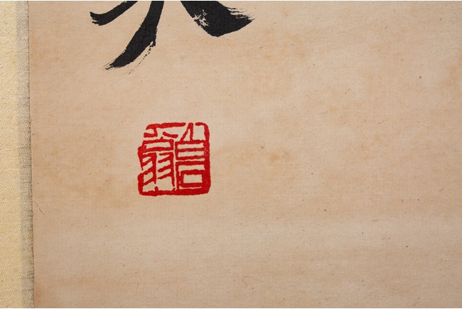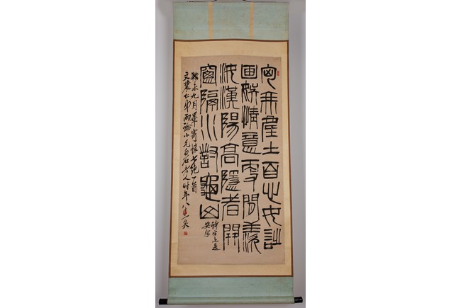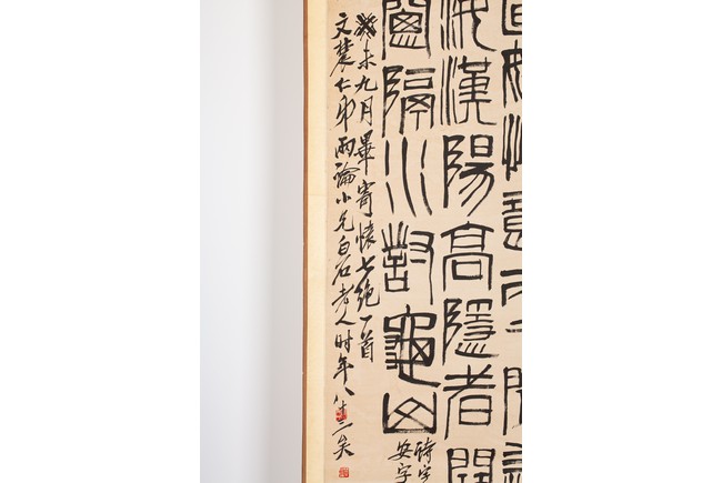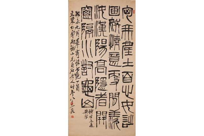 Chinese. Ink on paper. Seal Script Calligraphy. Hanging scroll. Inscribed and signed with Baishi Laoren, with three seal marks. Attributed to Qi Baishi.