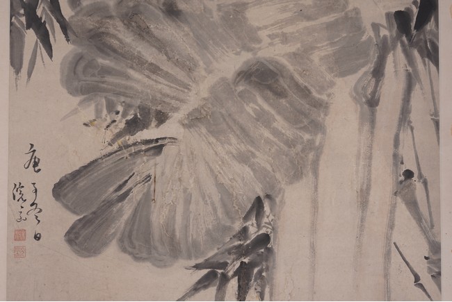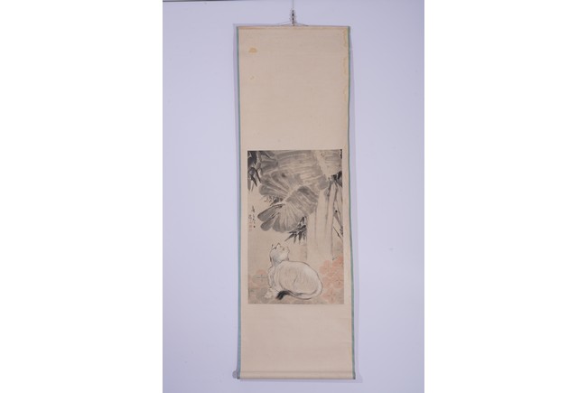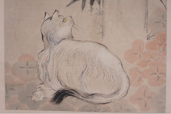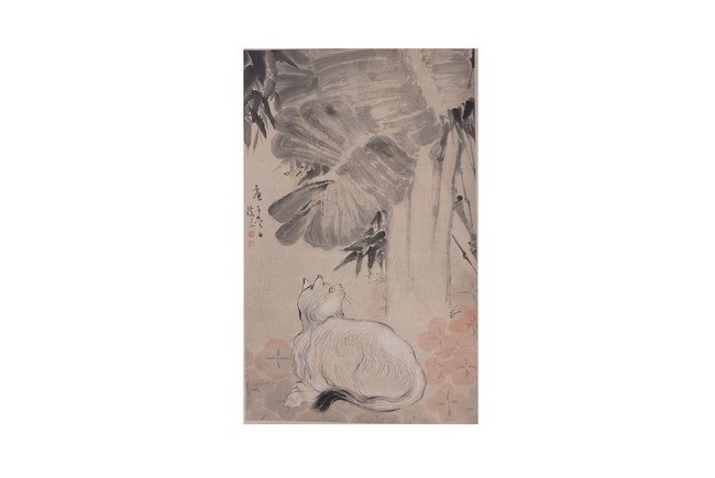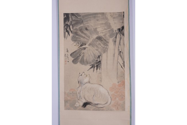 Chinese. Artist unknown. Color and ink on paper. Hanging scroll. Depicting a resting cat watching the banana tree and bamboos in the background. Inscribed and with two seal marks.