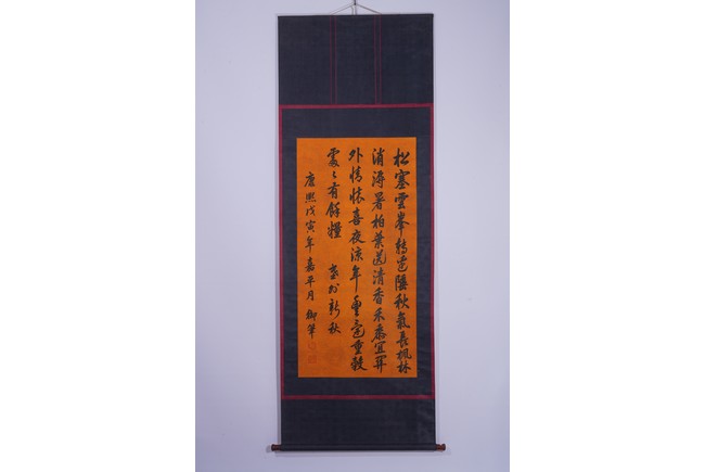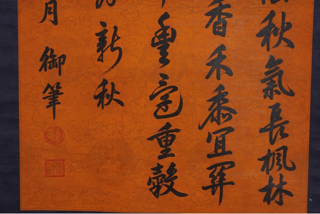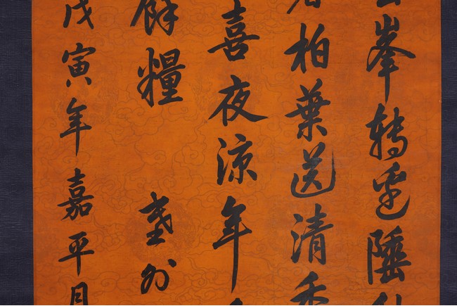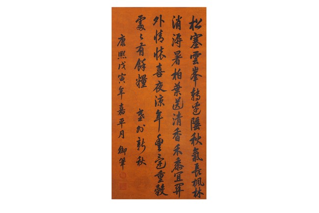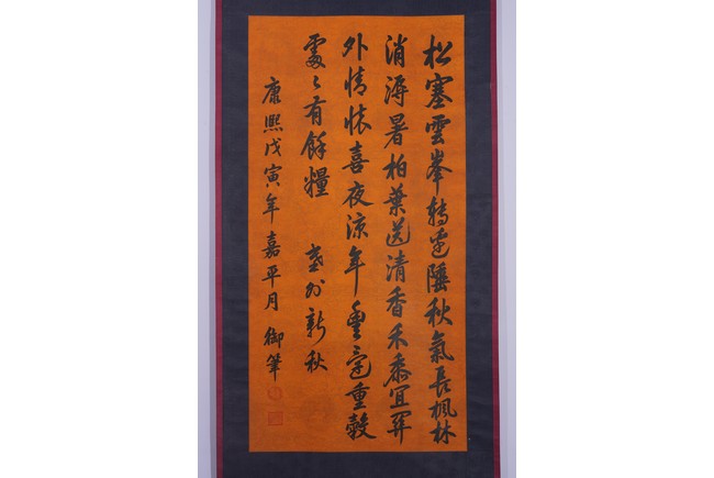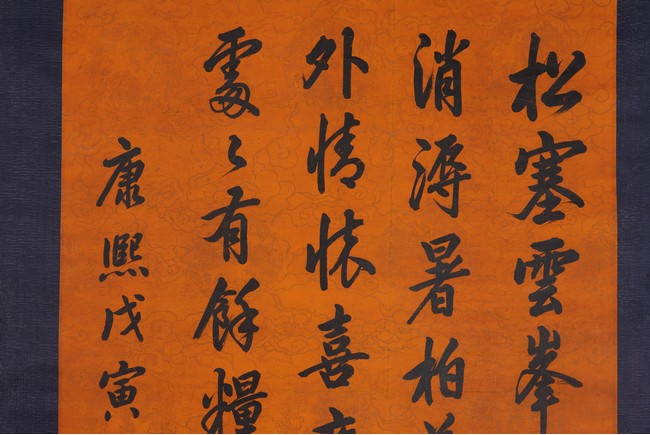 Chinese. Ink on paper. Running script. Inscribed and signed Yu Bi, with two seal marks. Hanging scroll. Attributed to the Emperor Kangxi.