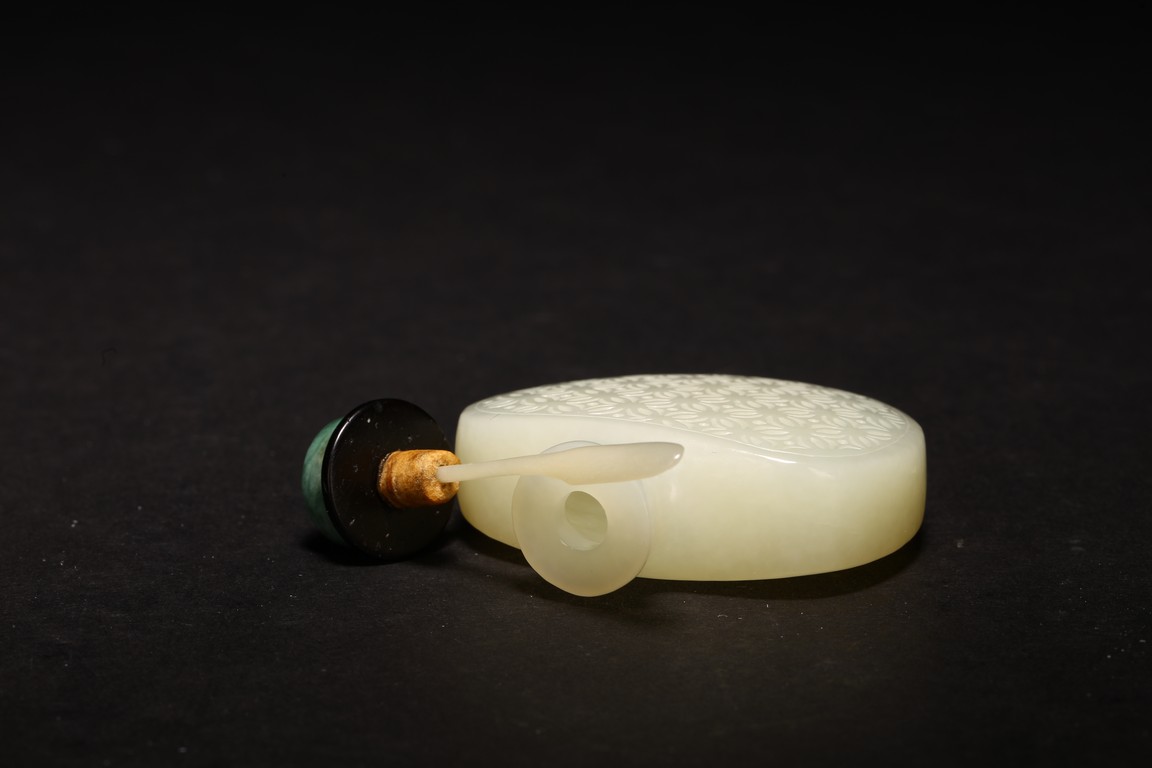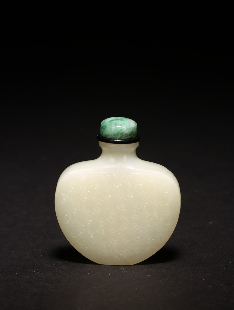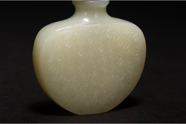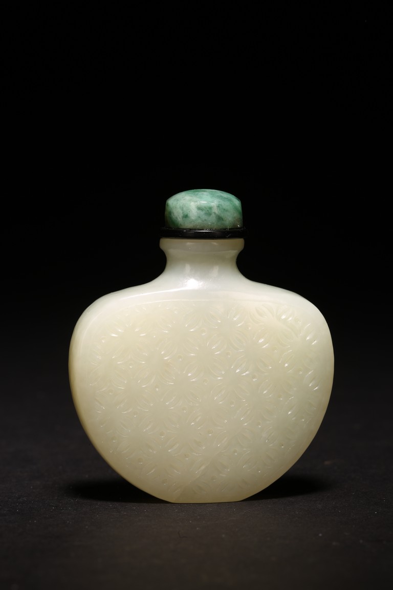 Chinese. The flattened bottle, each side carved with dense petal form decorations, the stone is of even pale white tone, with jadeite stopper. Qing Dynasty period.