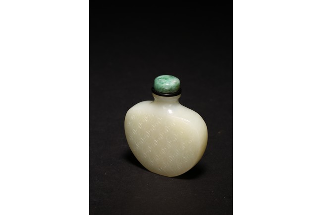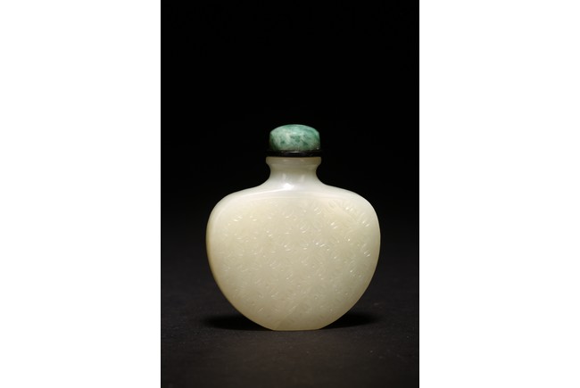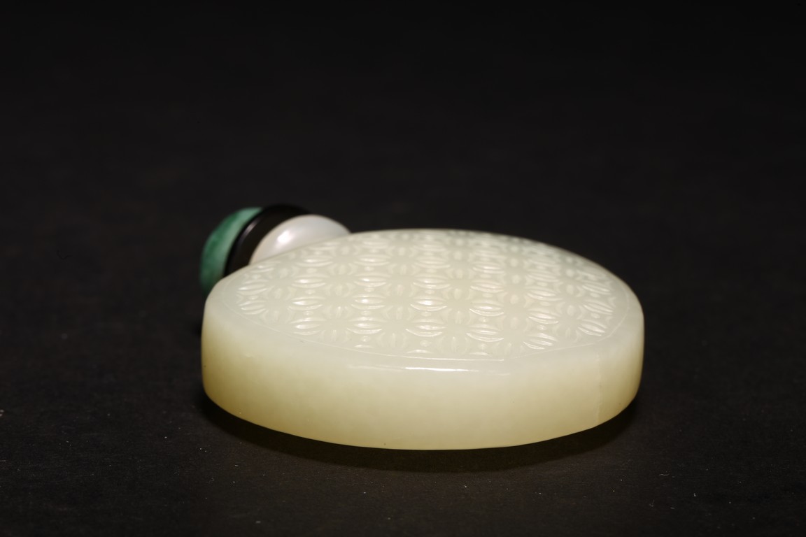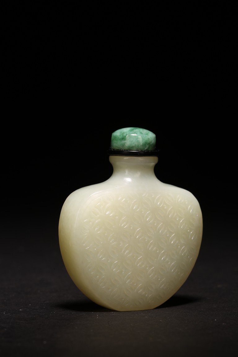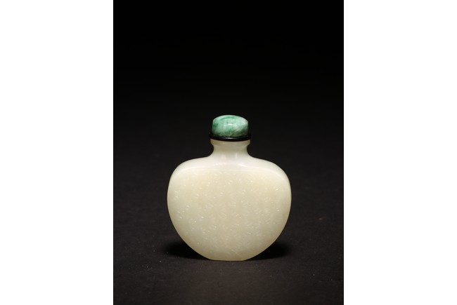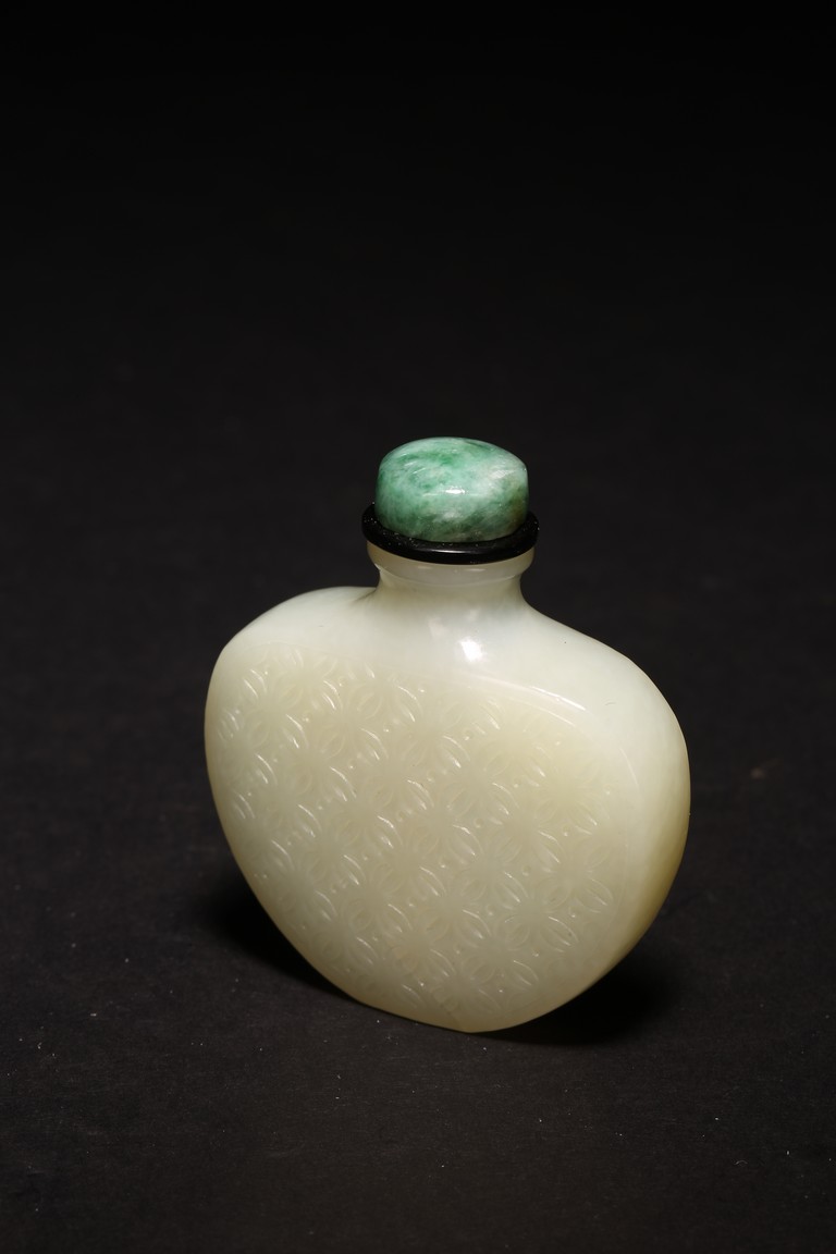 Chinese. The flattened bottle, each side carved with dense petal form decorations, the stone is of even pale white tone, with jadeite stopper. Qing Dynasty period.