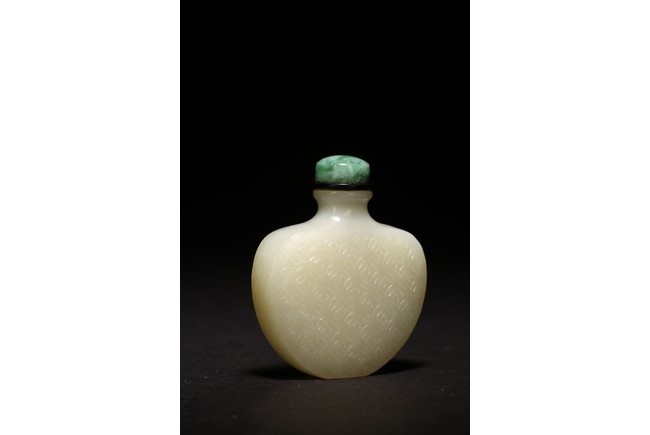 圓口,束頸,鼓腹下收。白玉製成,玉質潔白,瑩潤光潔,包漿肥厚,蓋為翡翠製成,翠色濃艷青綠,種水俱佳。