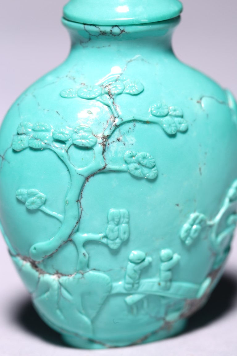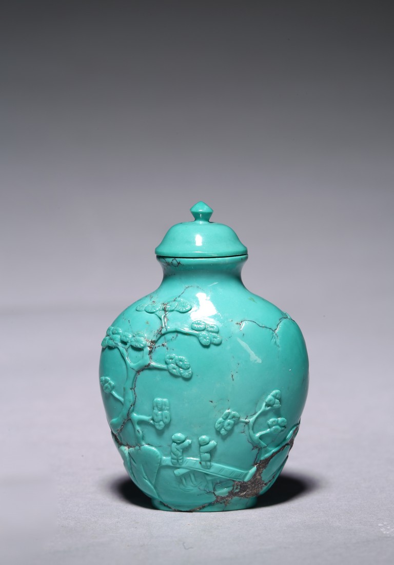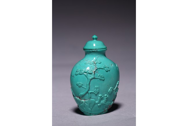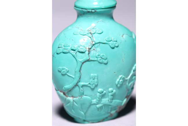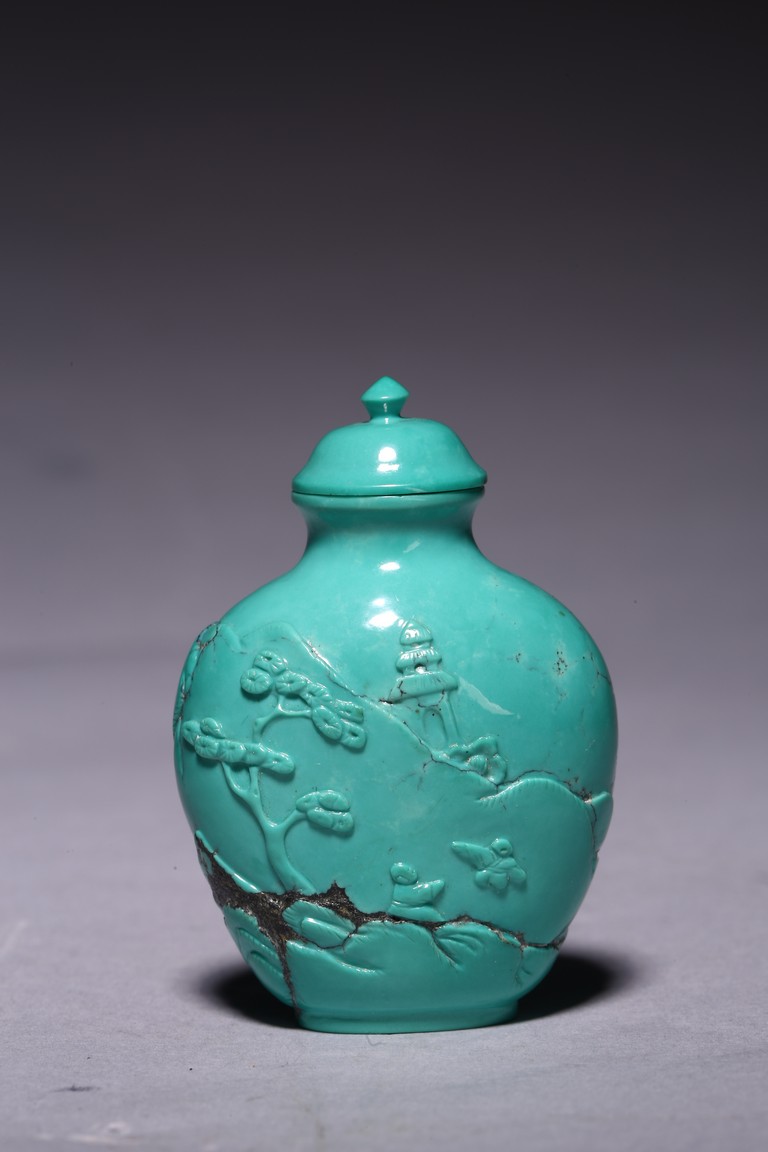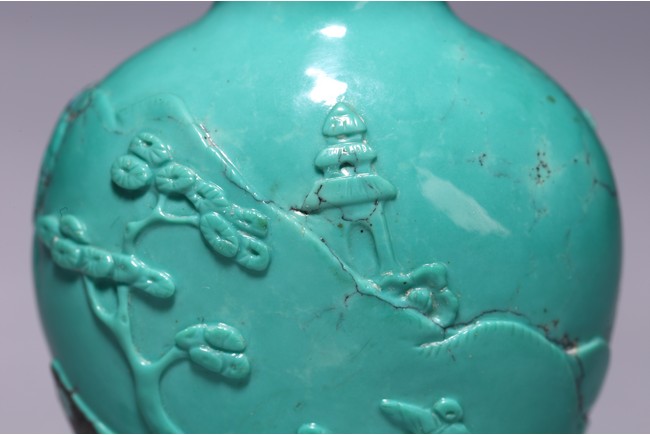 The turquoise bottle carved with figures in a mountainous landscape strewn with pine trees, fitted with turquoise stopper. Mid-Qing Dynasty period.