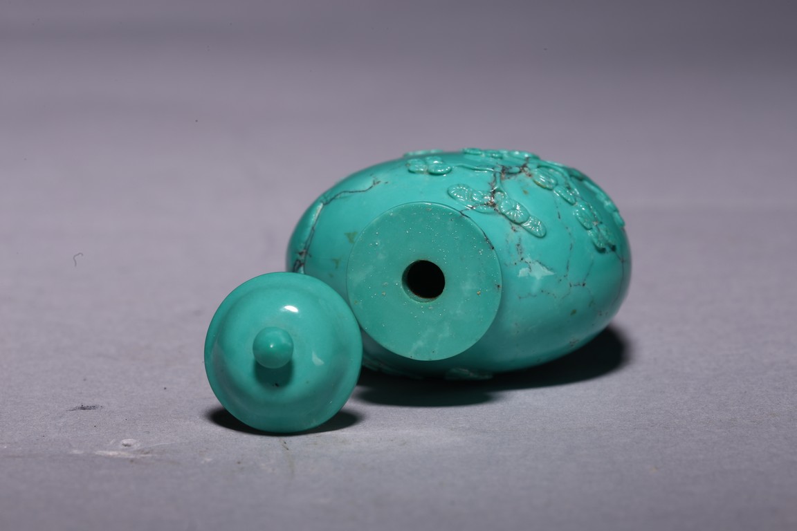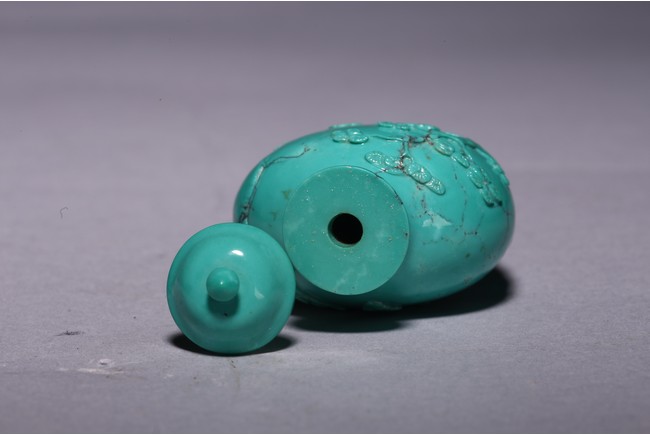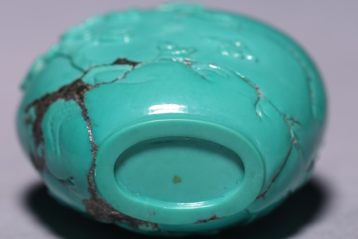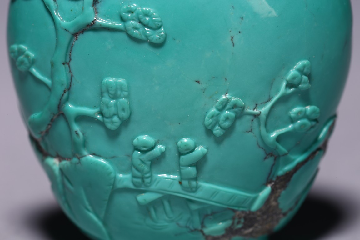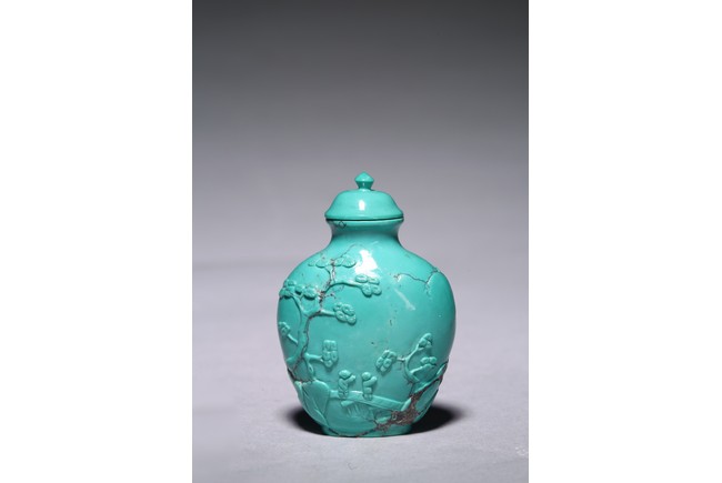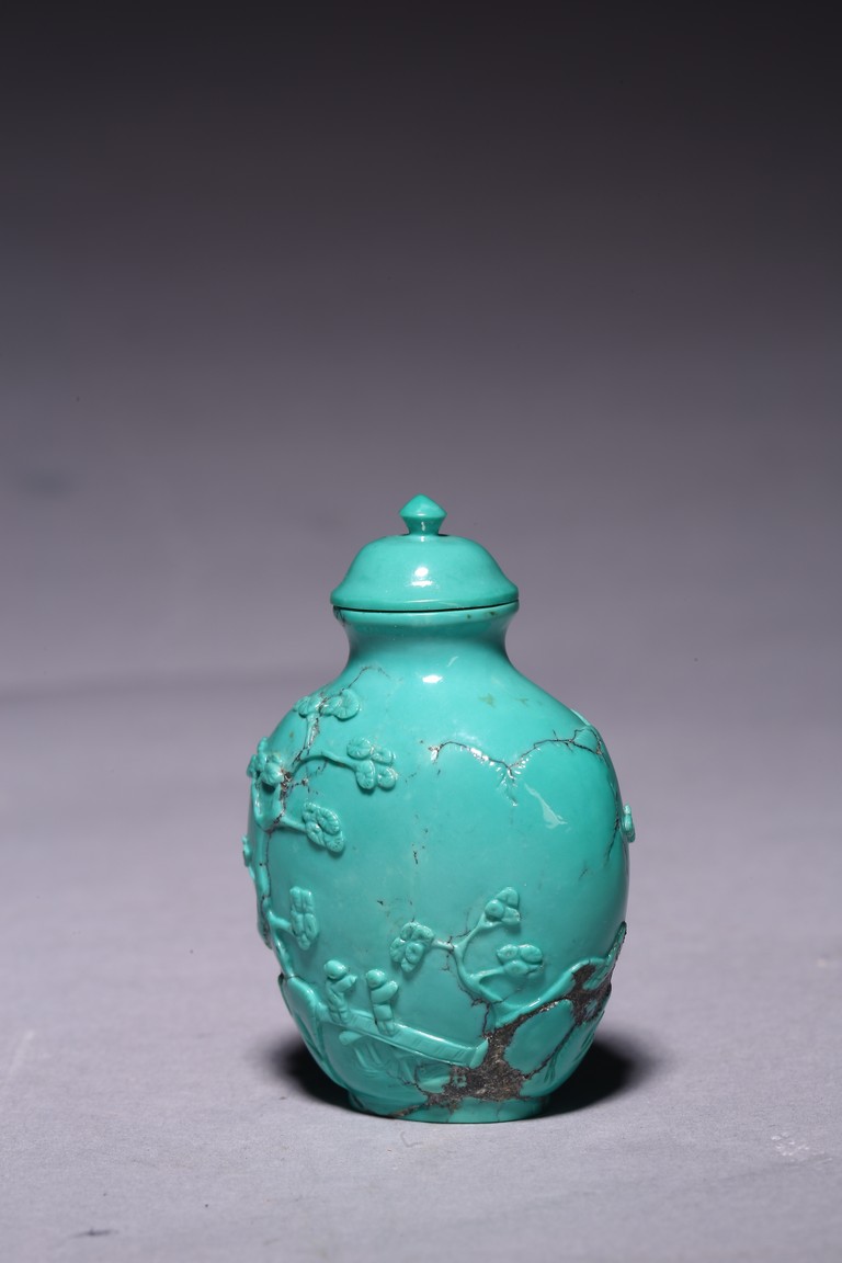 The turquoise bottle carved with figures in a mountainous landscape strewn with pine trees, fitted with turquoise stopper. Mid-Qing Dynasty period.