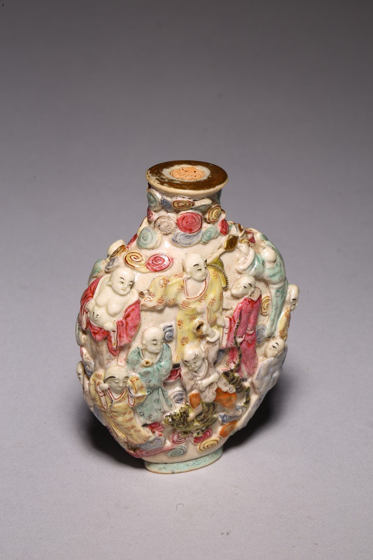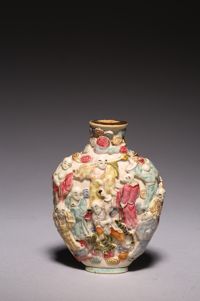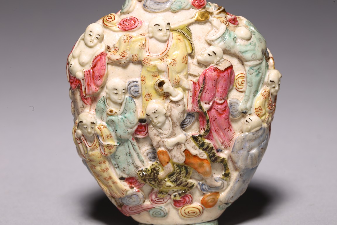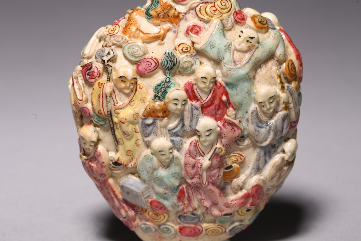 Chinese. Moulded around the body in relief with eighteen luohan figures in various postures, the base inscribed with four character Qianlong reign mark. Qing Dynasty Qianlong period.