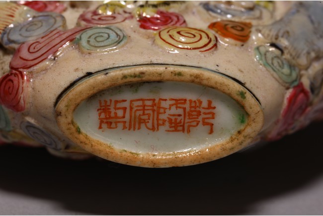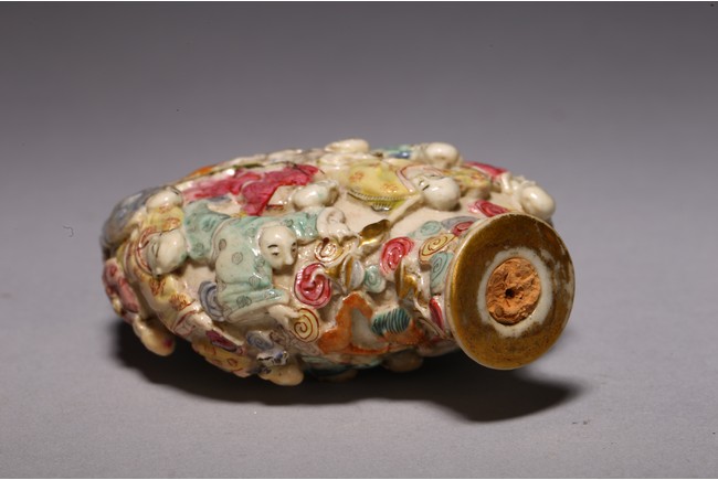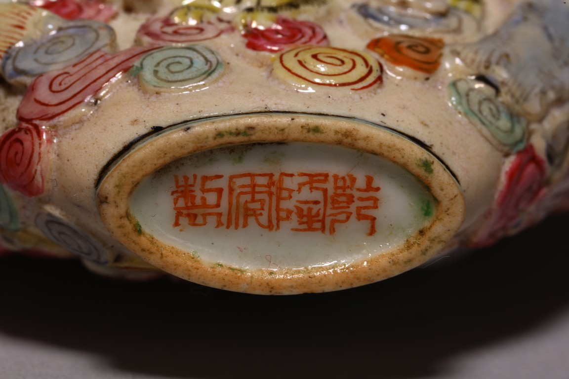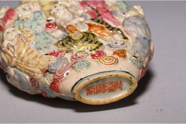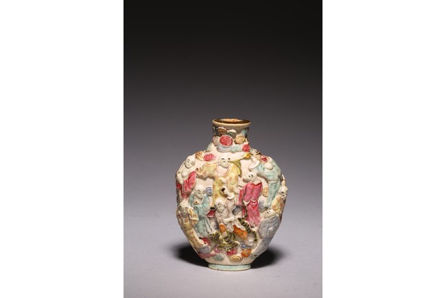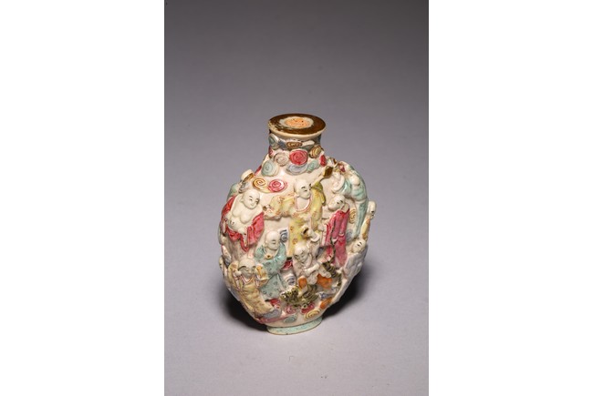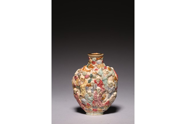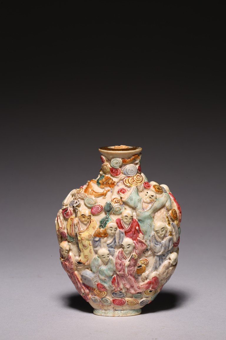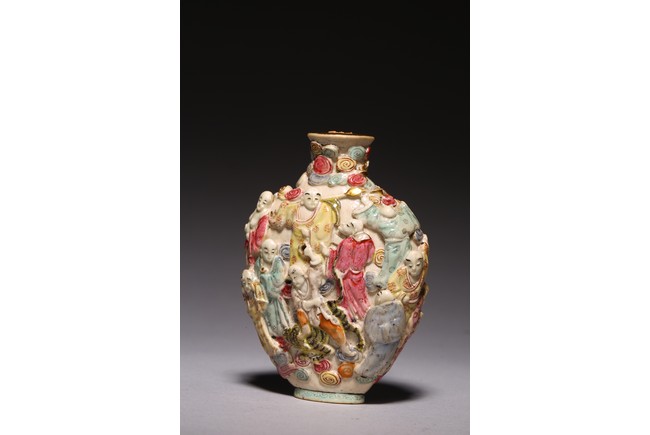 Chinese. Moulded around the body in relief with eighteen luohan figures in various postures, the base inscribed with four character Qianlong reign mark. Qing Dynasty Qianlong period.