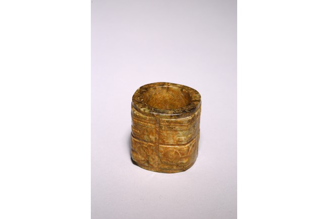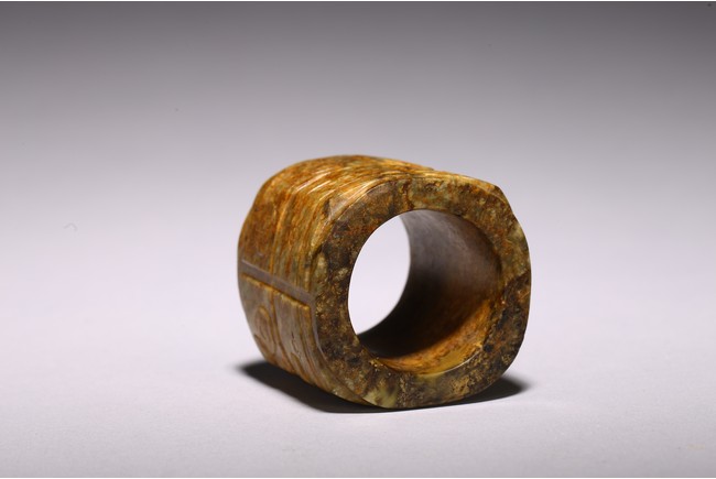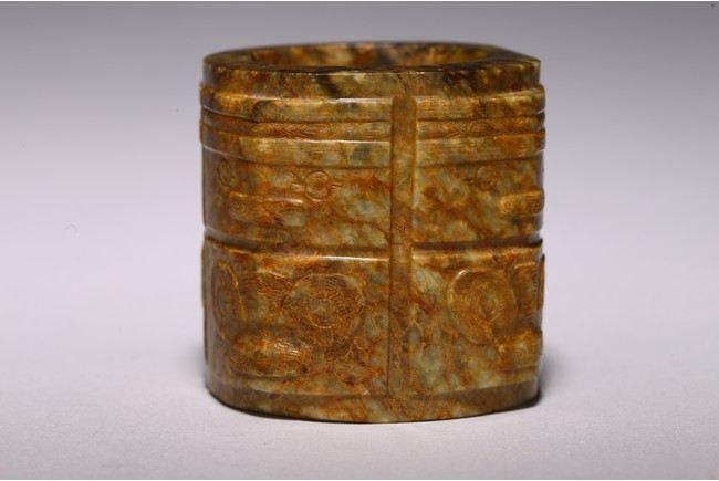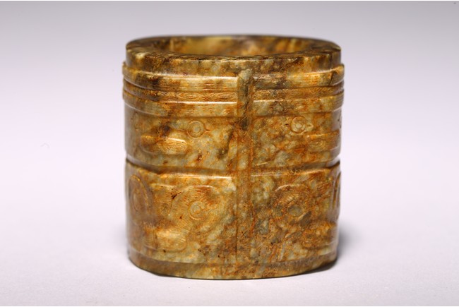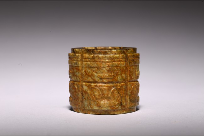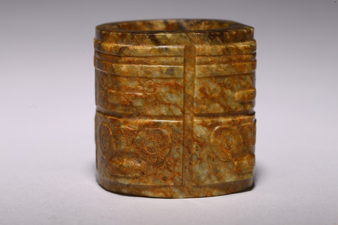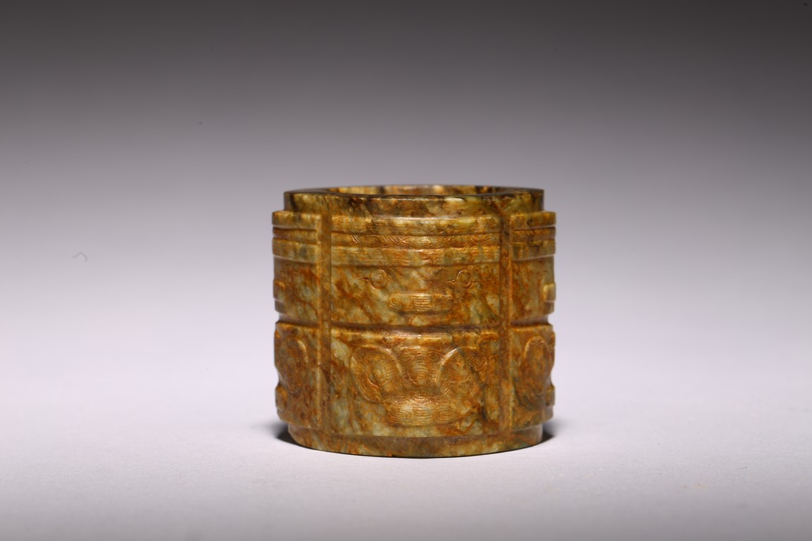 Chinese. Each corner carved with stylised 'taotie' mask, the four faces divided with recessed vertical band in the center of each side. Neolithic period, Liangzhu Culture.