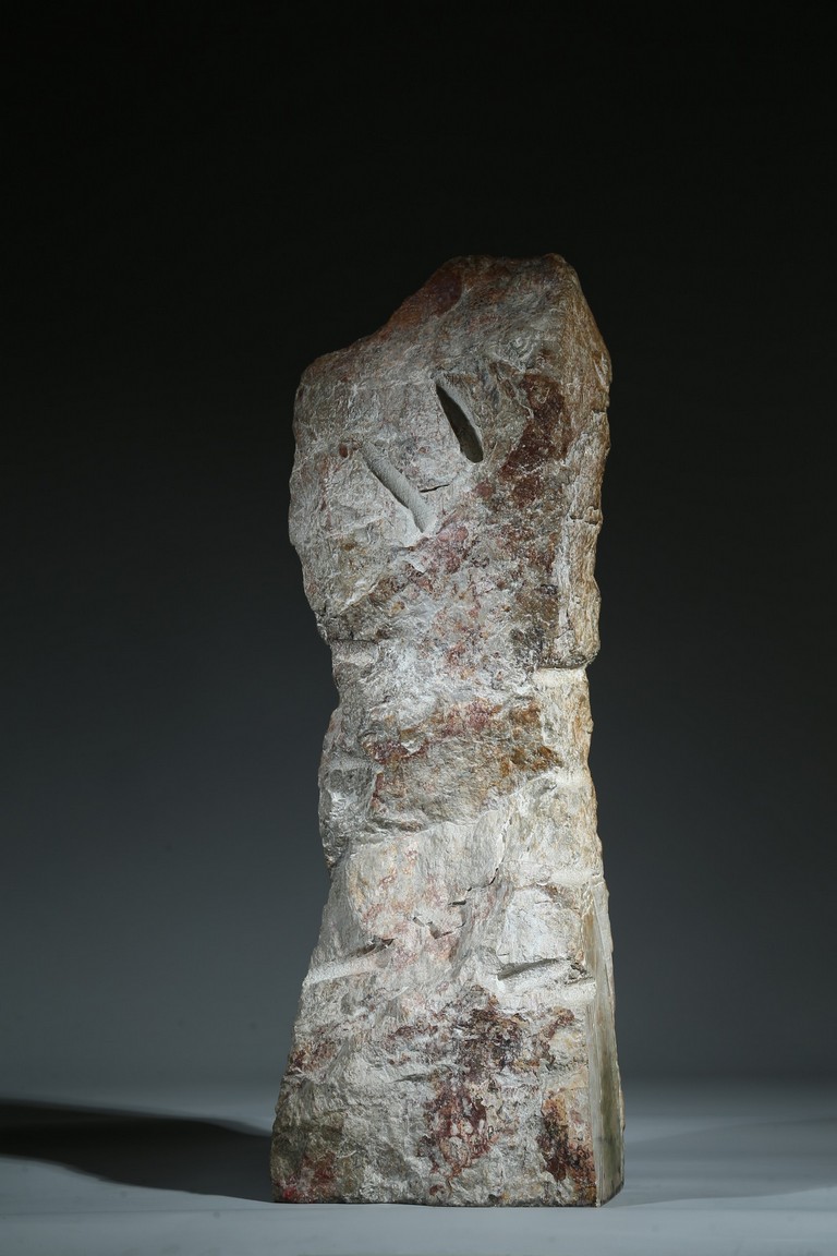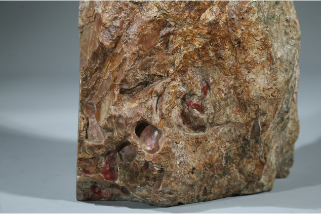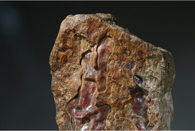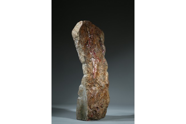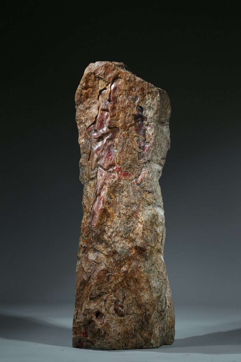 Of naturalistic irregular form, this rare large upright boulder with ochre tone skin exposed to reveal the inside bright red 'chicken-blood' inclusions. 'chicken-blood' is one of the most valued material in Chinese culture, and red is traditionally considered symbolic of good luck, soapstone of this color was gifted on occasions of marriage, birthdays, promotions and success.