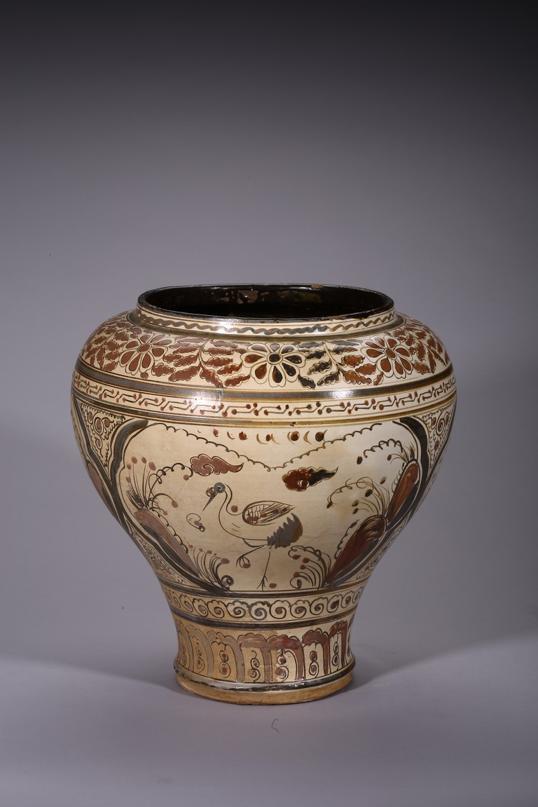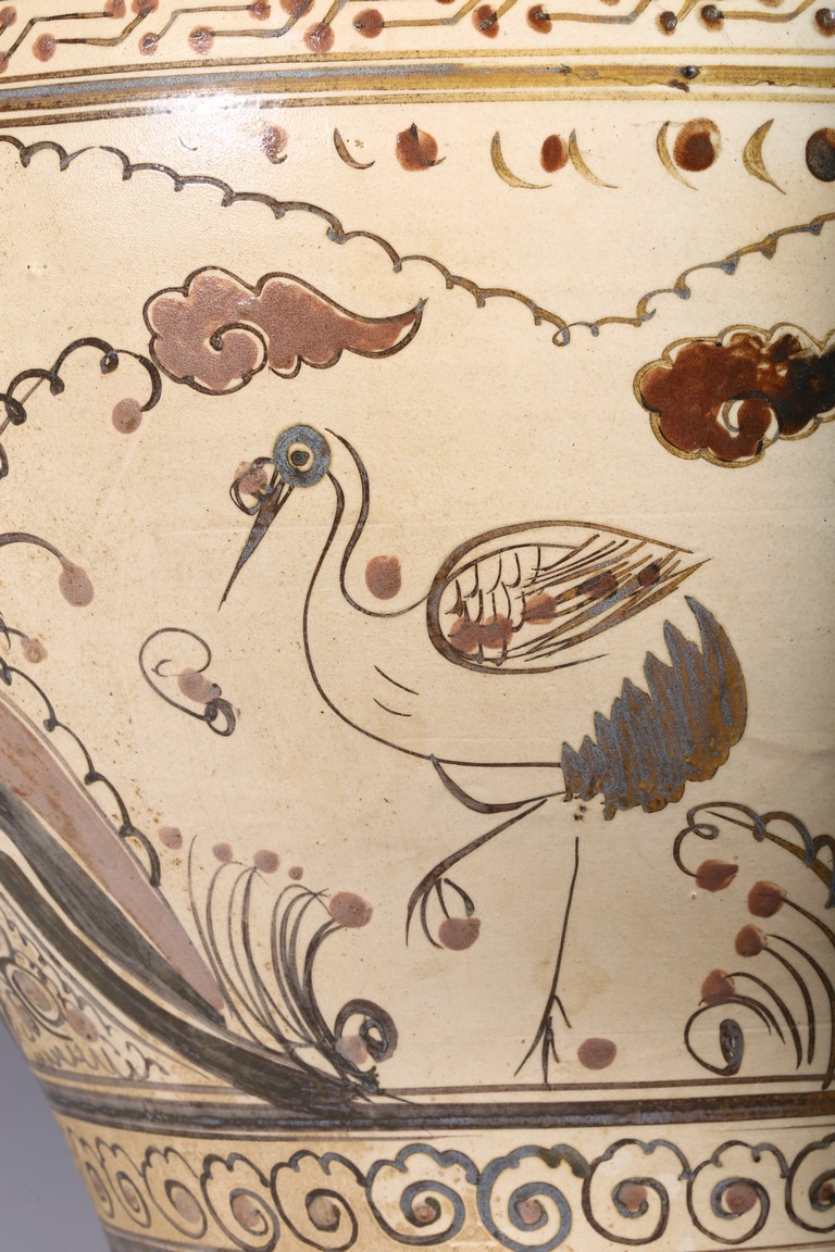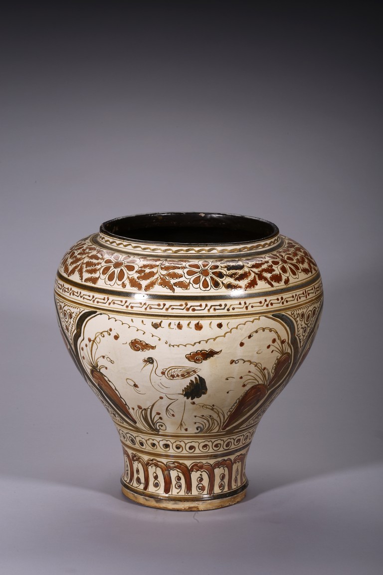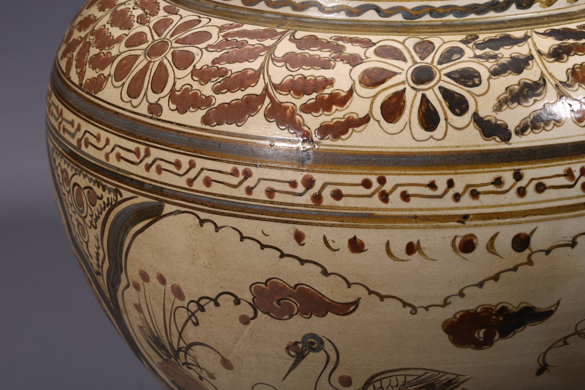 Yuan Dynasty period. The high-shouldered, tapering body is boldly painted in brown pigments with crane standing on one foot surrounded by orchids enclosed in lobed cartouches, the shoulder decorated with a band of leafy flowers and foot with a band of upright leaves, base unglazed revealing pale brown body.