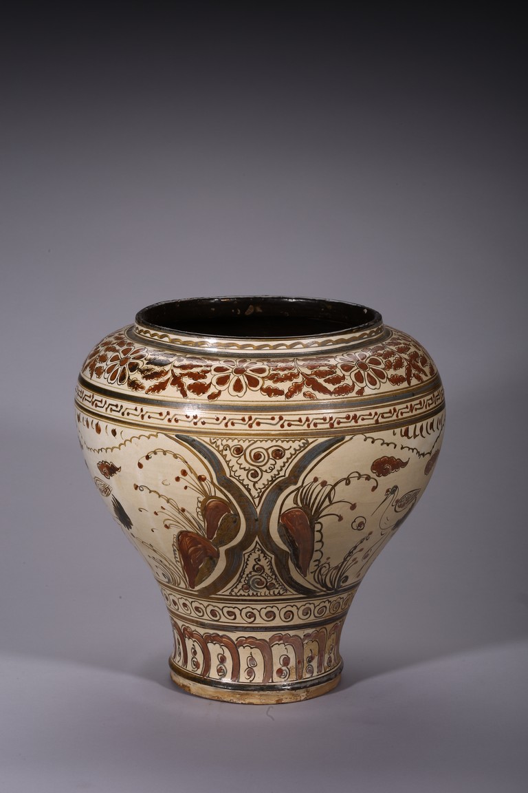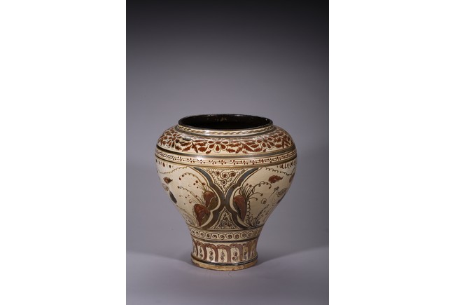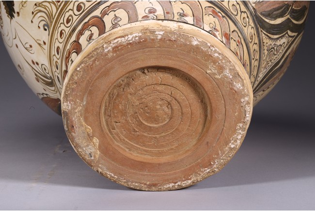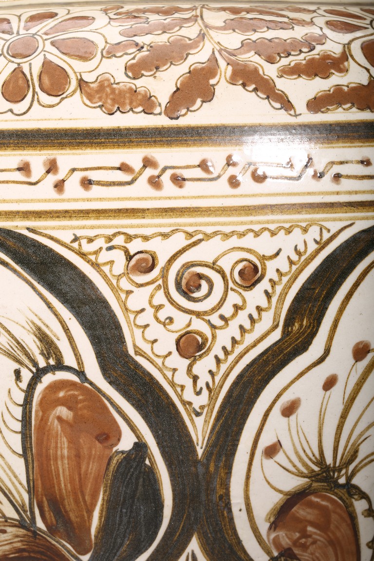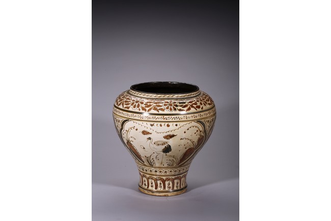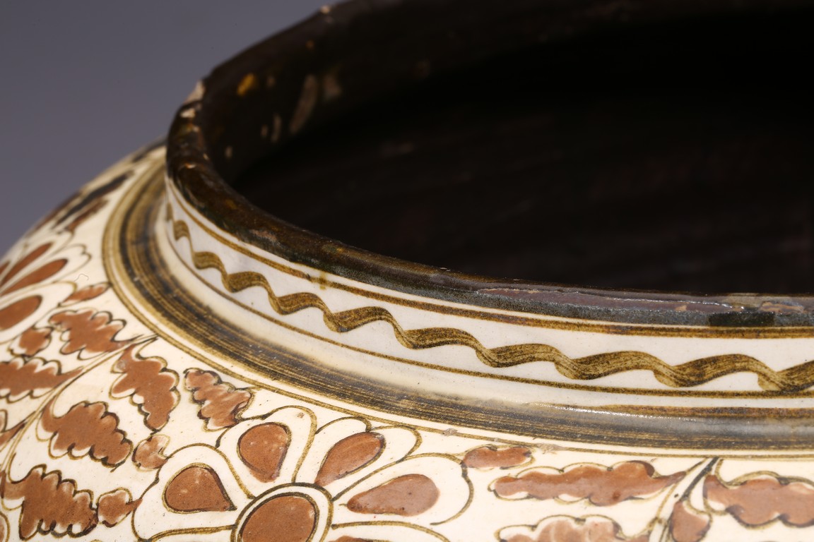 Yuan Dynasty period. The high-shouldered, tapering body is boldly painted in brown pigments with crane standing on one foot surrounded by orchids enclosed in lobed cartouches, the shoulder decorated with a band of leafy flowers and foot with a band of upright leaves, base unglazed revealing pale brown body.