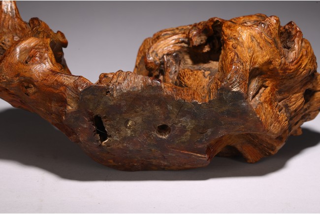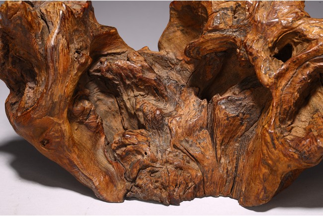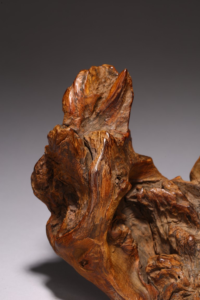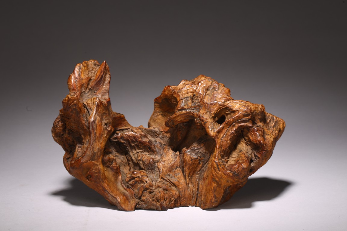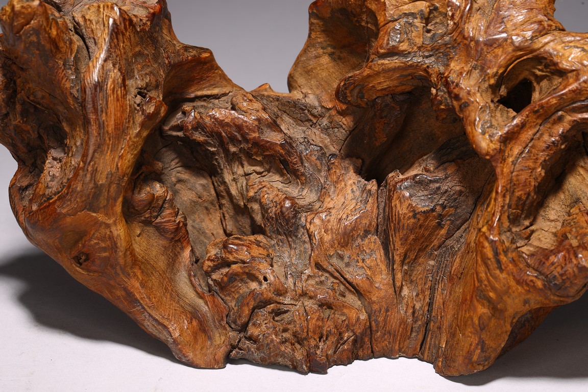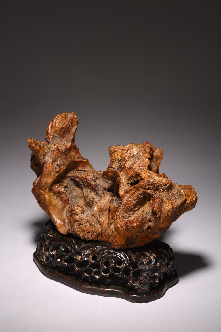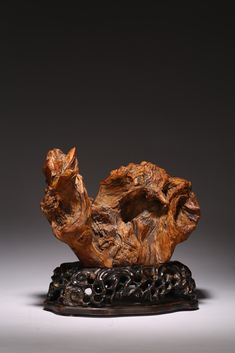 Chinese. Modelled in the form of an uneven weathered rock, the wood in a rich reddish-brown colour, reticulated hardwood stand. Qing Dynasty period.