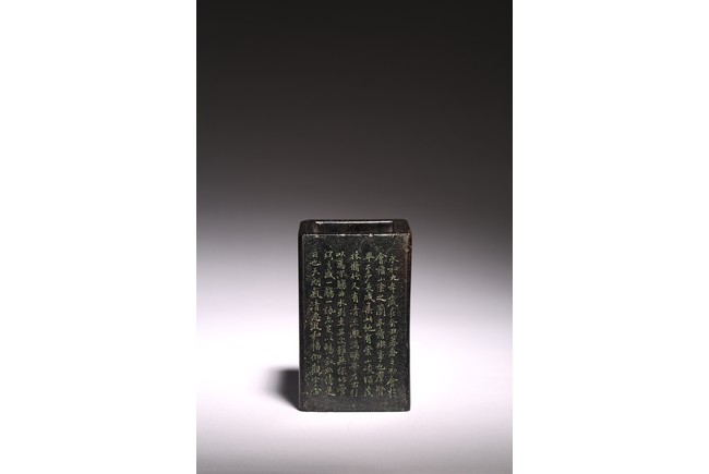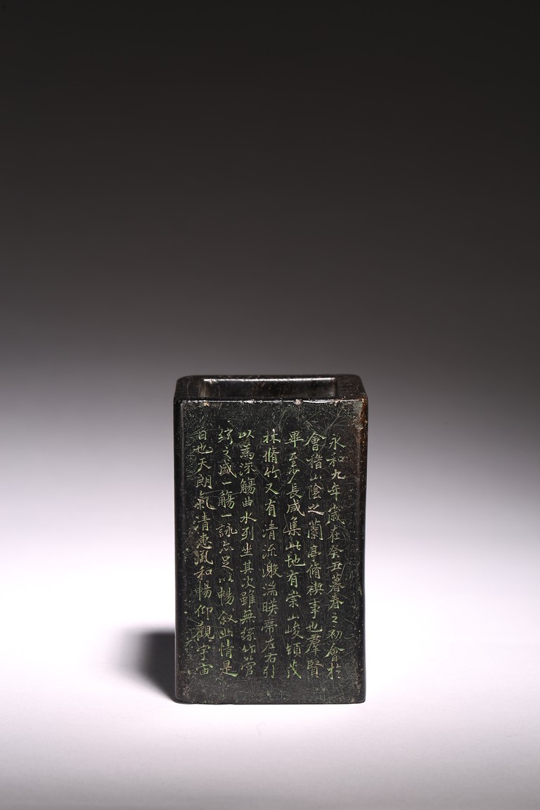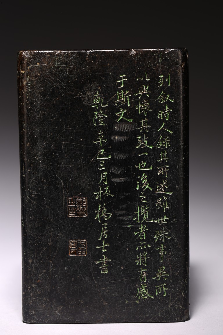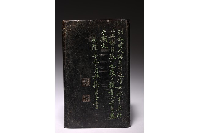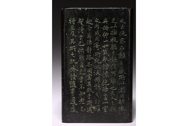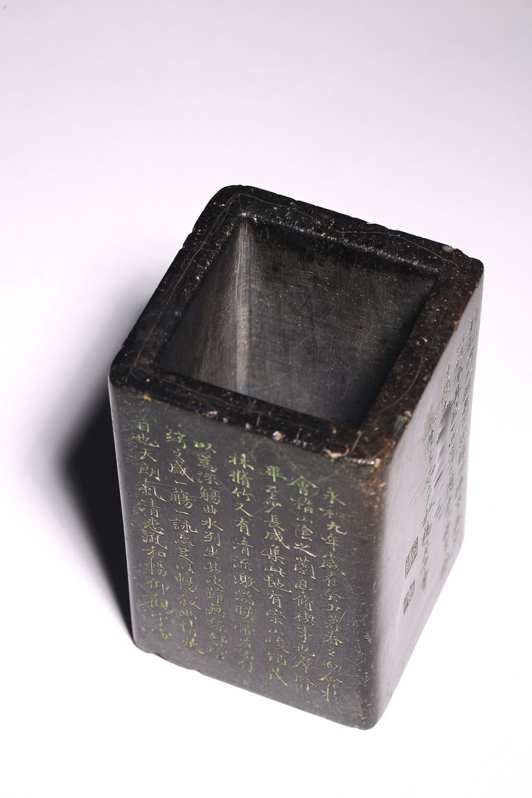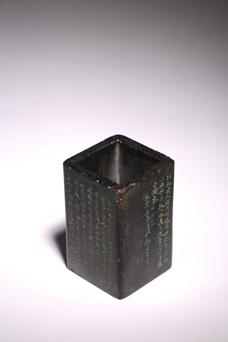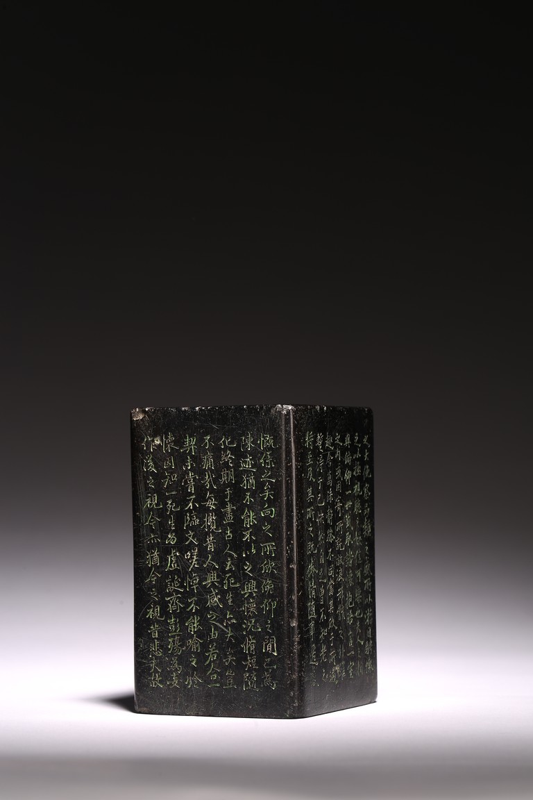 Chinese. Of rectangular form, the exterior body finely inscribed with green pigments on each side with poetry by Wang Xizhi, signed Zheng Xie with two seal marks. Qing Dynasty period.
