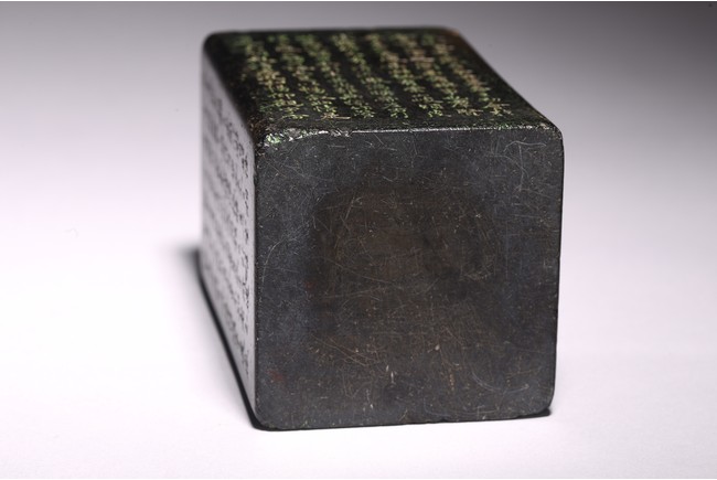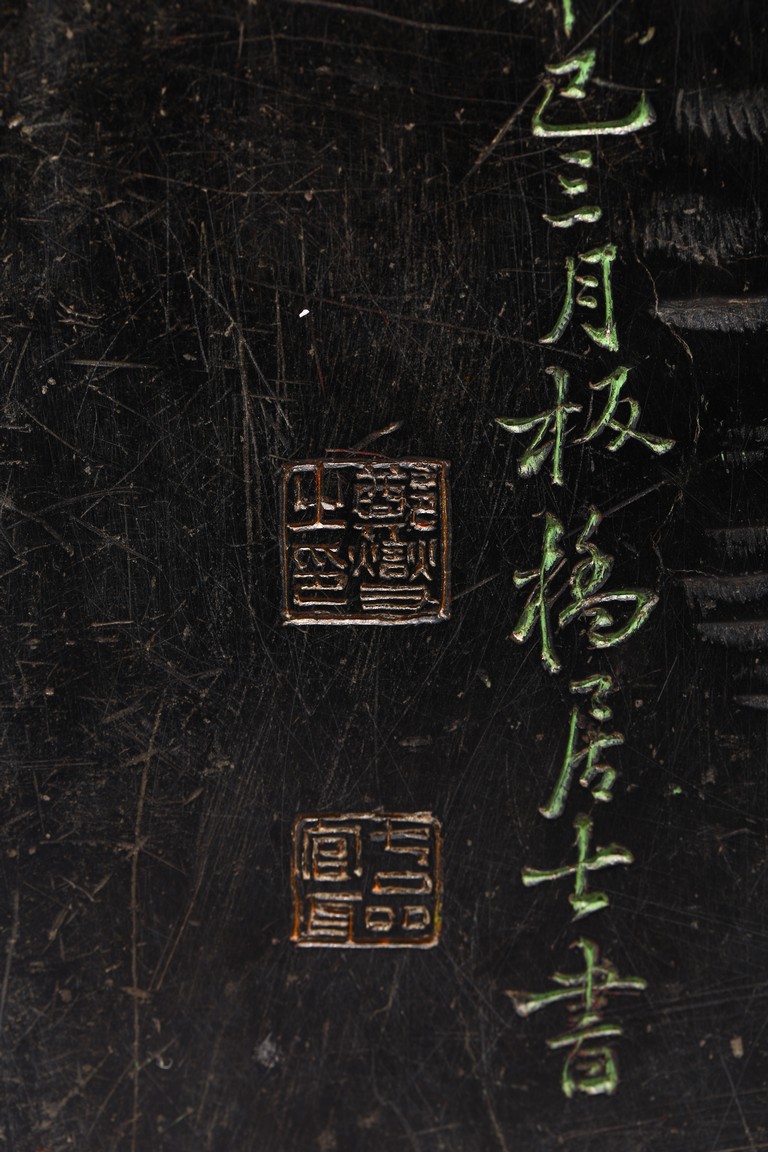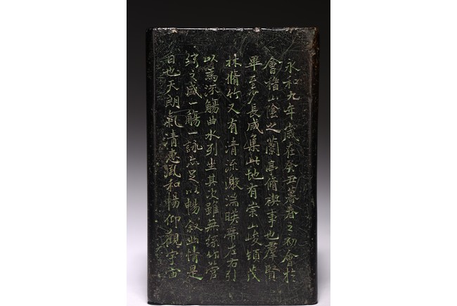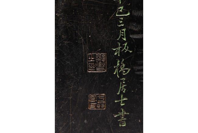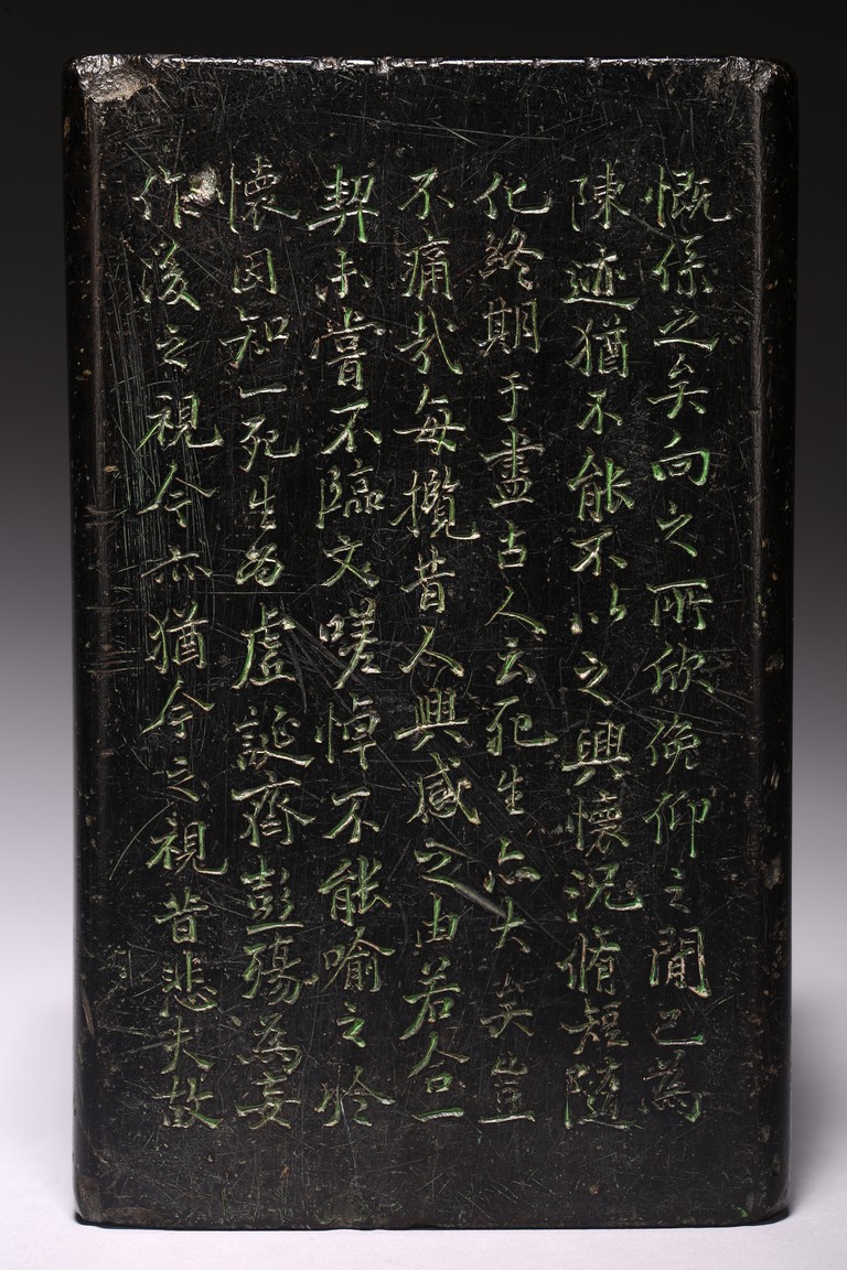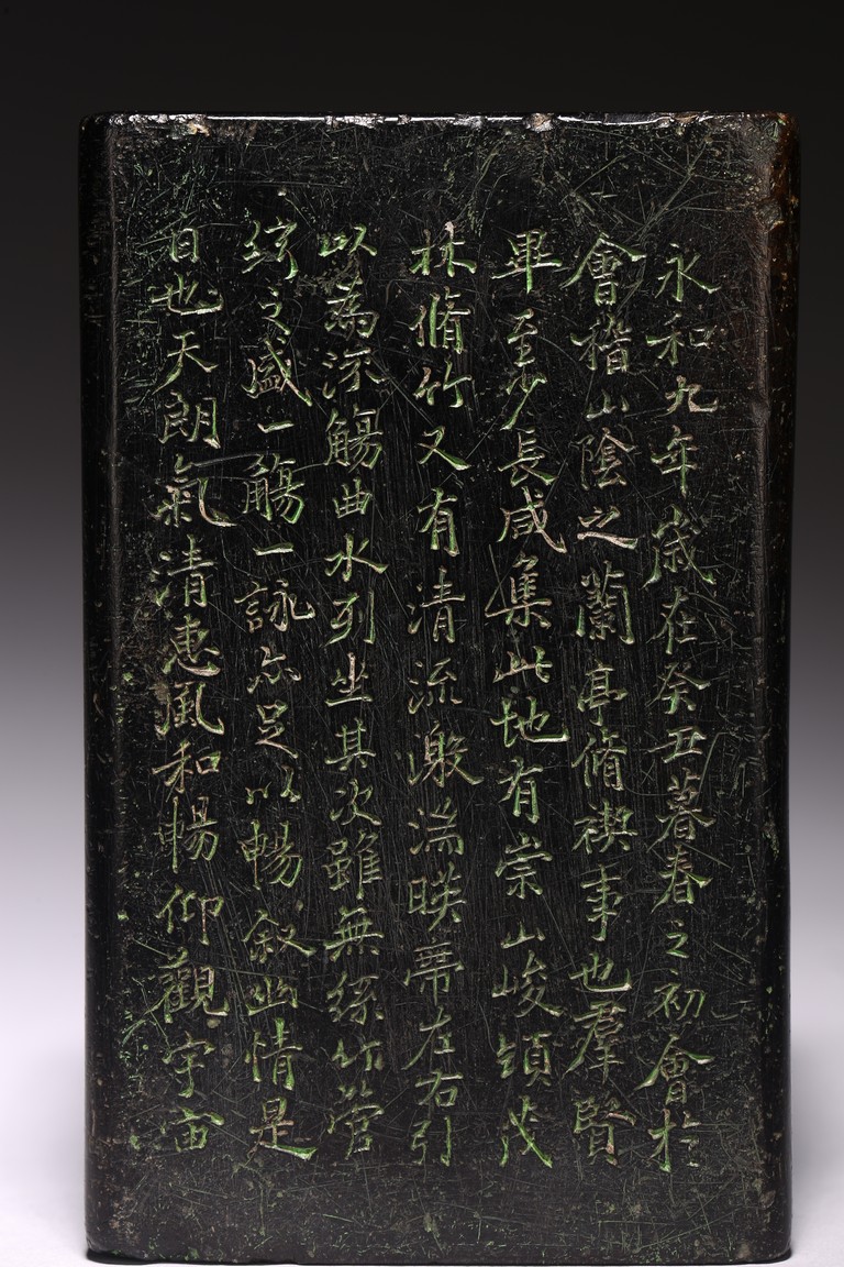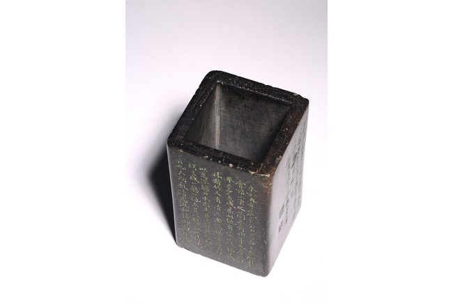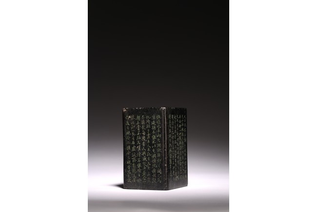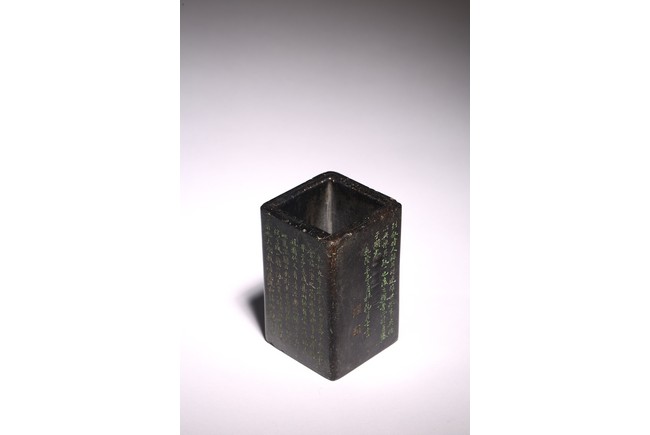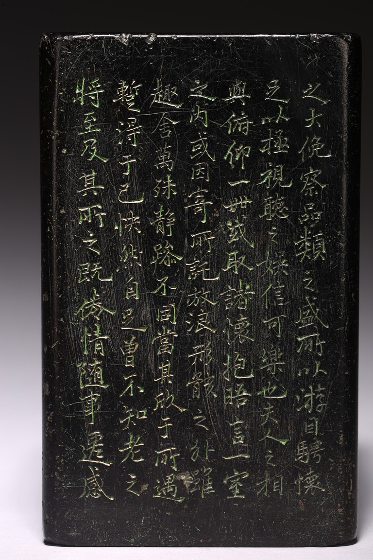 Chinese. Of rectangular form, the exterior body finely inscribed with green pigments on each side with poetry by Wang Xizhi, signed Zheng Xie with two seal marks. Qing Dynasty period.